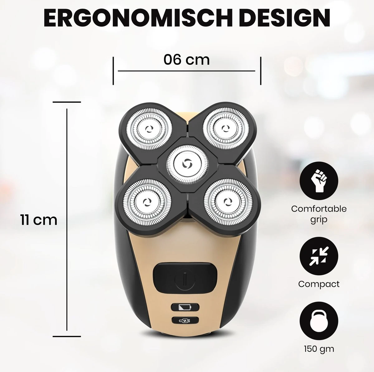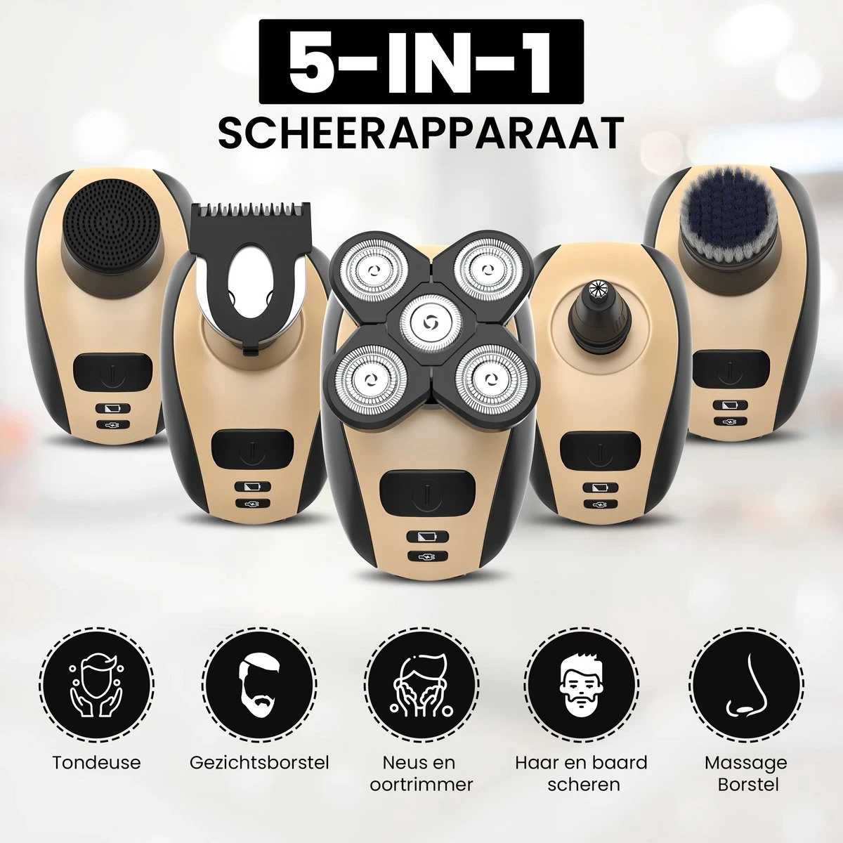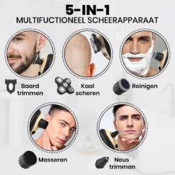 Dit scheerapparaat maakt het mogelijk om de complete verzorging van je gezicht met één apparaat te doen. Het apparaat beschikt over 5 verschillende opzetstukken, en ieder opzetstuk heeft een andere functie. Allereerst beschikt het apparaat over een scheerkop. Daarnaast wordt er een precisietrimmer opzetstuk met opzetkammen (3mm, 5mm, 7mm) geleverd waardoor je eindeloos kan variëren in het creëren van een unieke stijl. Ook bevat het een neustrimmer opzetstuk waarmee ongewenst neushaar en oorhaar gemakkelijk verwijderd kan worden. Voor het reinigen en onderhouden van een gezonde huid wordt er ook een gezichtsreiniging opzetstuk geleverd. Het 5e opzetstuk is een (massage) gezichtsspons wat gebruikt kan worden om stoppels te verzachten en de huid voor te bereiden op het scheren. Met dit 5 in 1 scheerapparaat heb je alles bij de hand om jezelf goed te verzorgen!