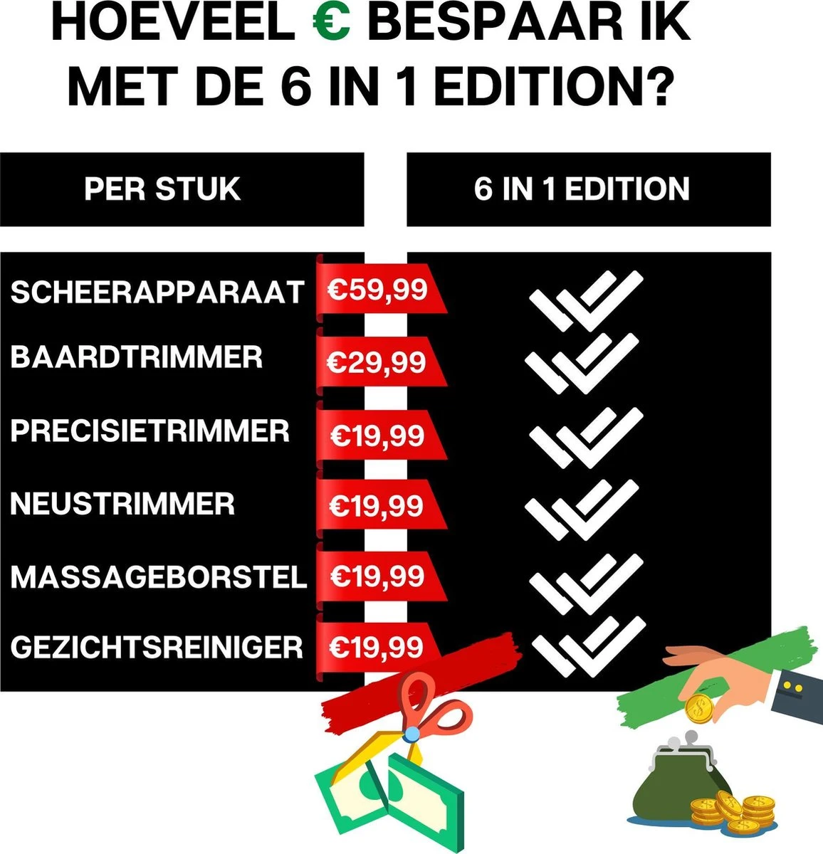✓ Multifunctioneel (6 in 1) – Ons alles-in-één scheerapparaat is met de 6 bijgeleverde opzetstukken de perfecte oplossing voor al jouw scheer- en trimbehoefte. Of het nu gaat om baard trimmen, huid reinigen of millimeteren, dit apparaat heeft het allemaal! Dankzij de verschillende opzetstukken, is het apparaat te gebruiken als een scheerapparaat, baardtrimmer, neustrimmer/oortrimmer, haartrimmer/tondeuse (3,5,7mm opzetstuk), precisietrimmer, massageborstel en gezichtsreiniger!