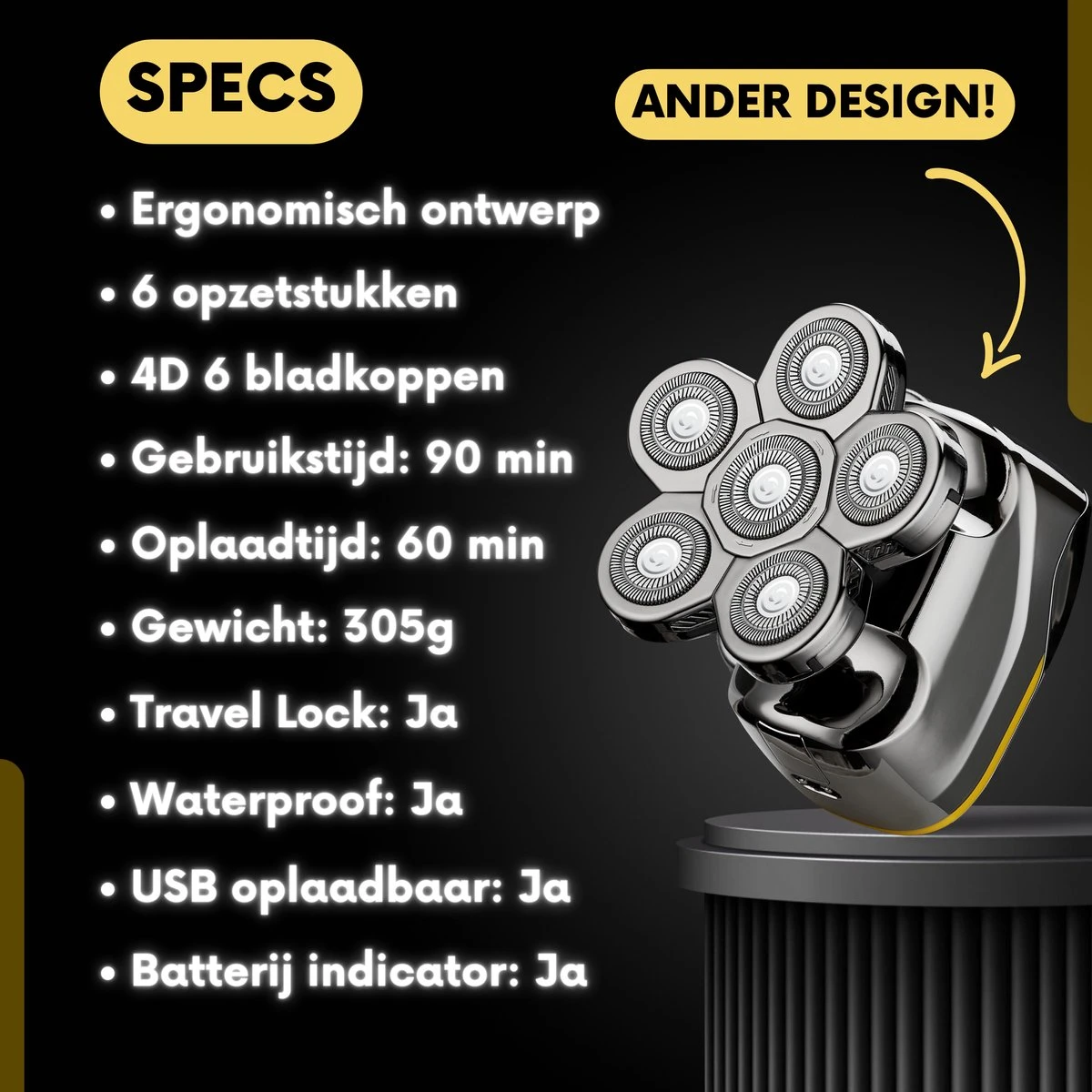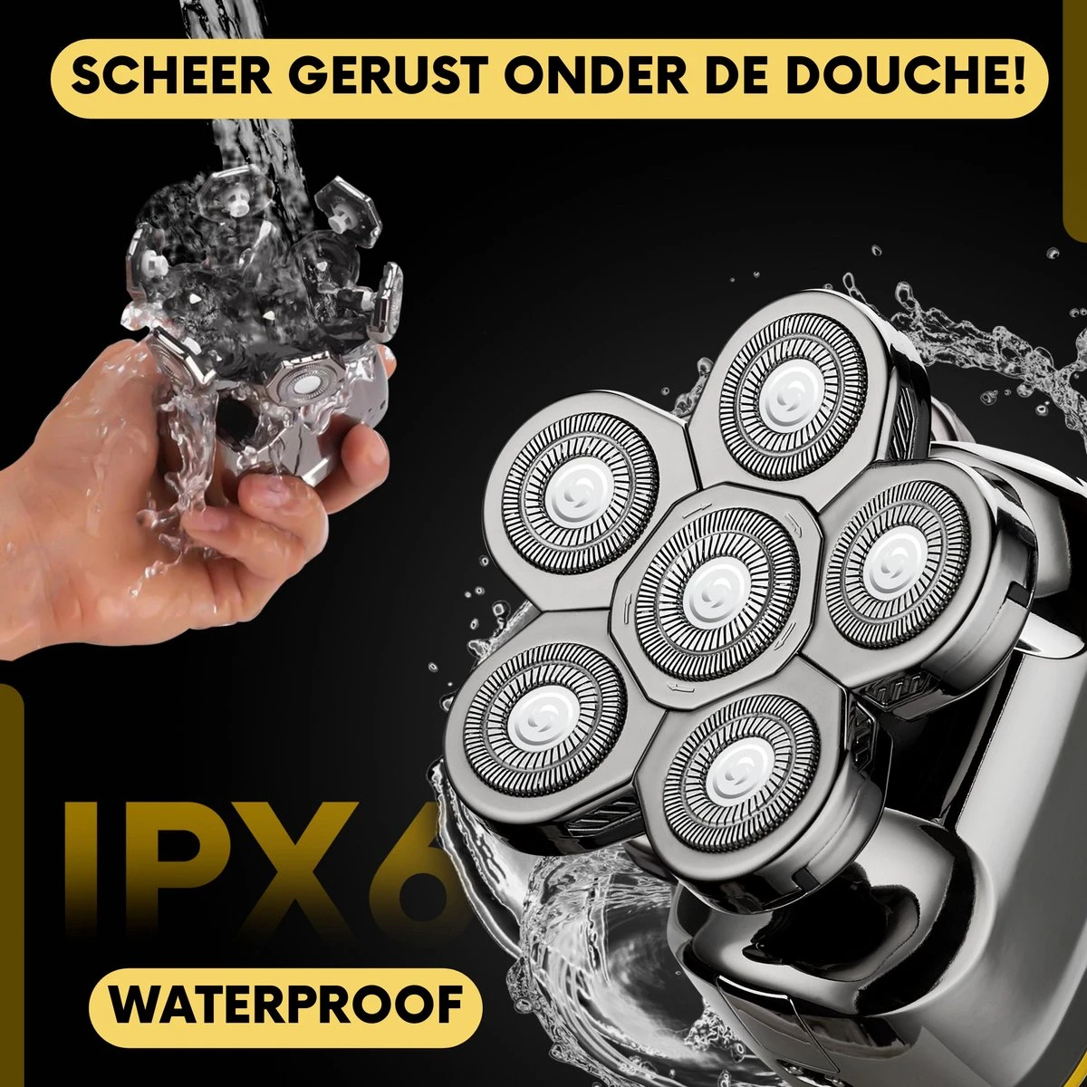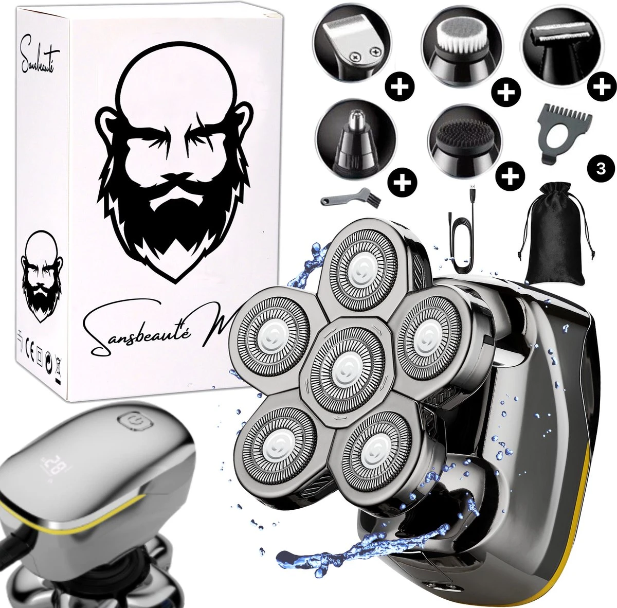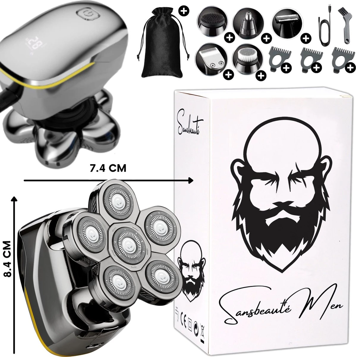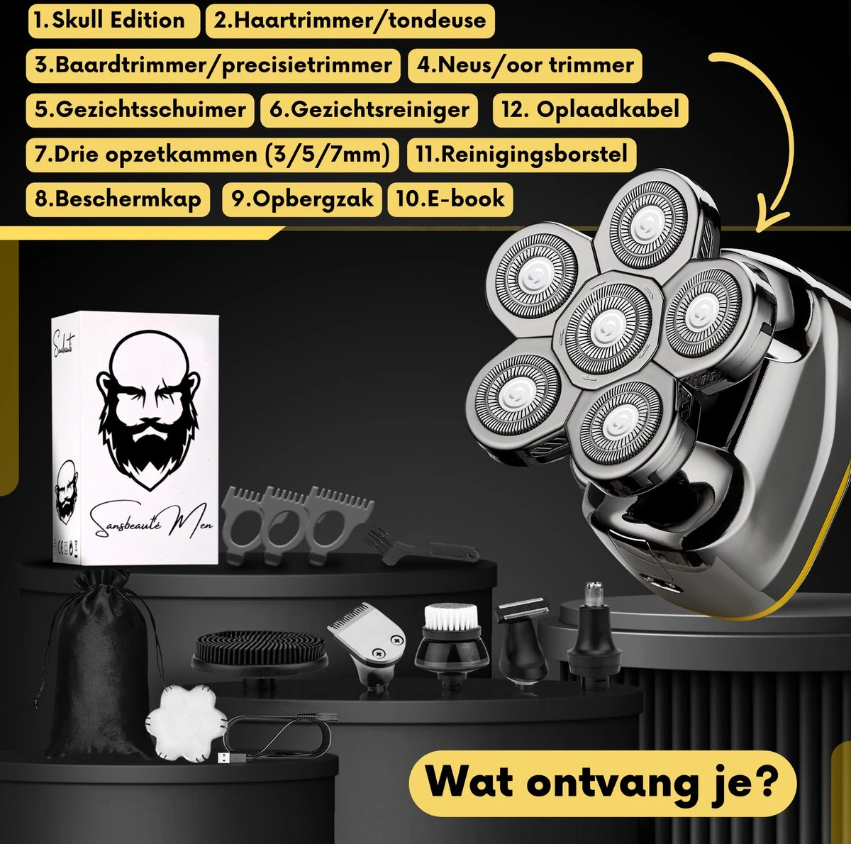 Klaar met ongewenst haar en scheermessen die snel bot worden en wondjes achterlaten tijdens het scheren? Sansbeauté® 6-in-1 Skull Edition is dé perfecte oplossing! Met 6 (!) flexibele 4D scheerkoppen, multifunctionele opzetstukken en draadloos ontwerp scheer jij elk haartje op je hoofd, gezicht en het lichaam razendsnel weg! De 6 roterende scheerbladen bewegen moeiteloos mee met de contouren van je gezicht en hoofd waardoor elk haartje wordt geschoren! Met de 6 verschillende opzetstukken heb je alles meteen in huis, en dat met slechts één investering! Door de verwerking van een LED-display kun je nu gemakkelijk aflezen wanneer je moet reinigen en opladen. Ook is het apparaat volledig waterproof waardoor een snelle behandeling onder de douche of een makkelijke reiniging onder de kraan een feit is! Als kers op de taart ontvang je een exclusief e-book met waardevolle tips, zodat je het product optimaal kunt benutten en de beste resultaten kunt behalen!