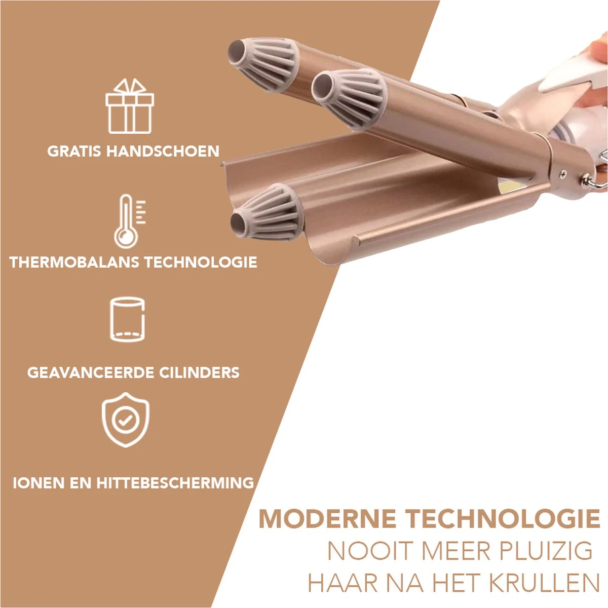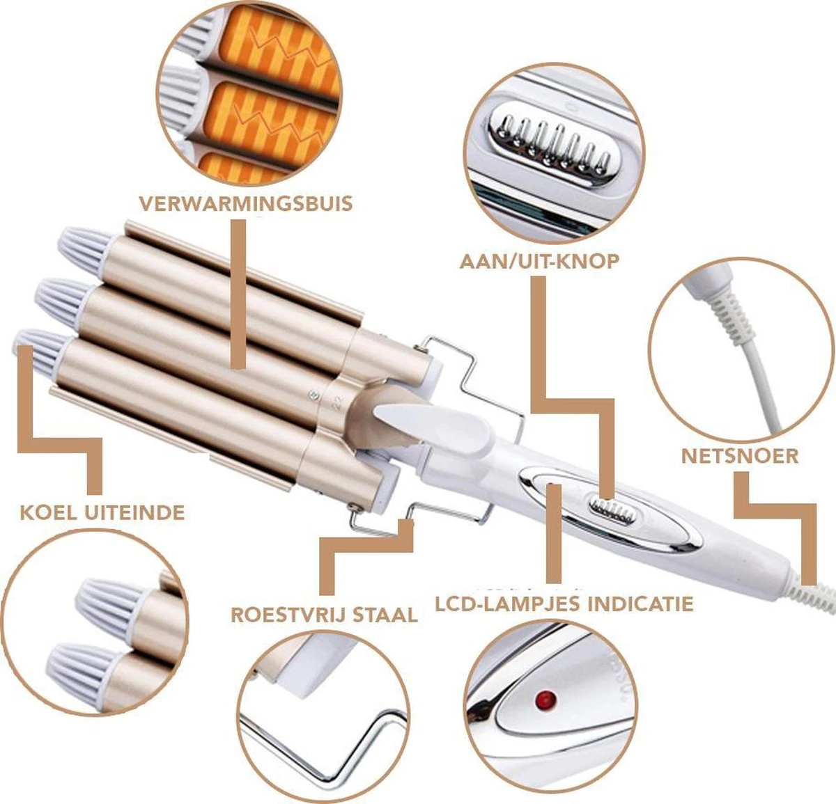 De Achaté golvenkrultang is met 3 cilinders ideaal voor het makkelijk creëren van golvend haar. De wave krultang bevat 3 temperatuurstanden en is daardoor voor ieder type haar geschikt. Met behulp van de meegeleverde professionele handschoen en geïsoleerde uiteinden is het verbranden van je vingers verleden tijd. De wavertang heeft een antislip handvat en is dankzij de keramische bladen binnen 30 seconden op temperatuur.