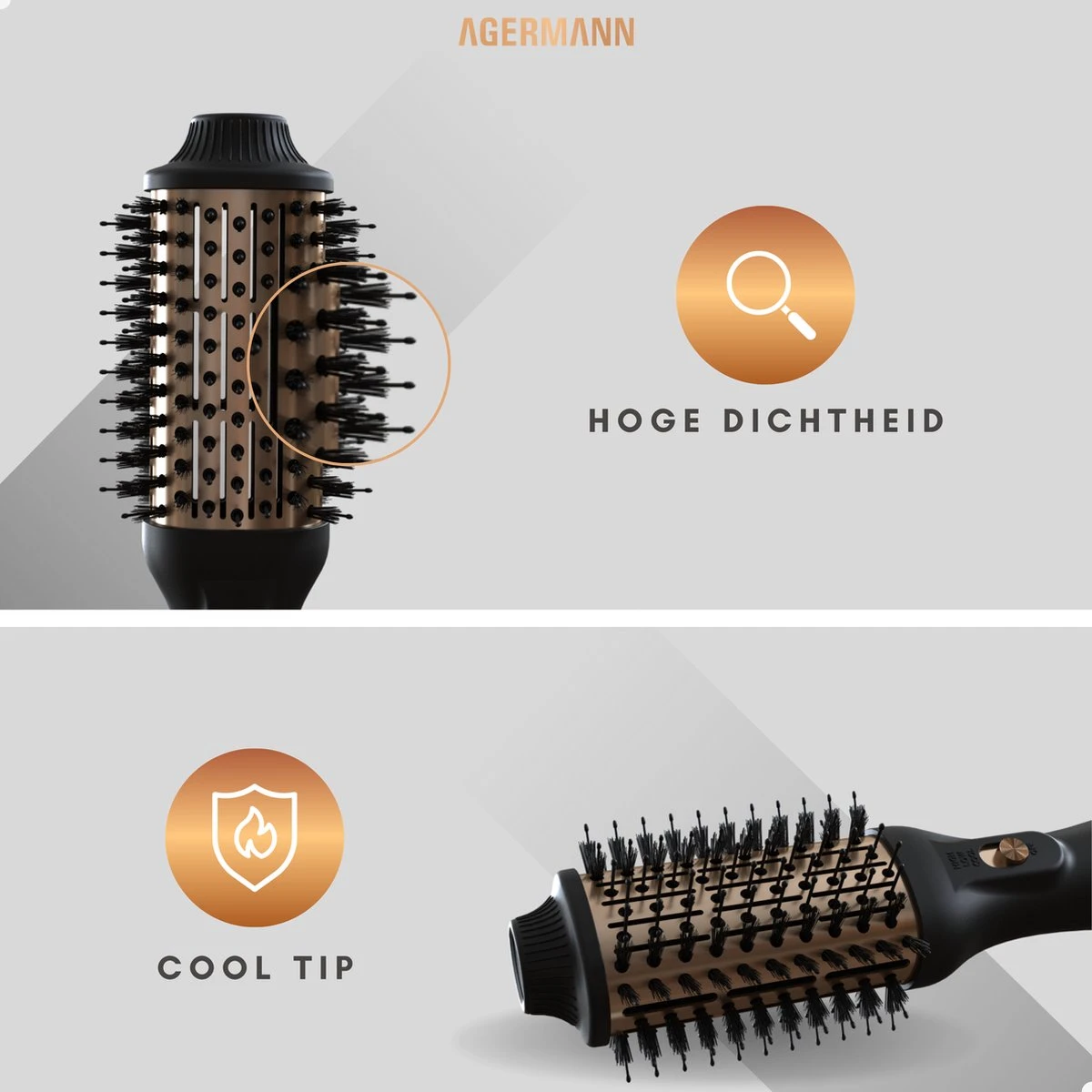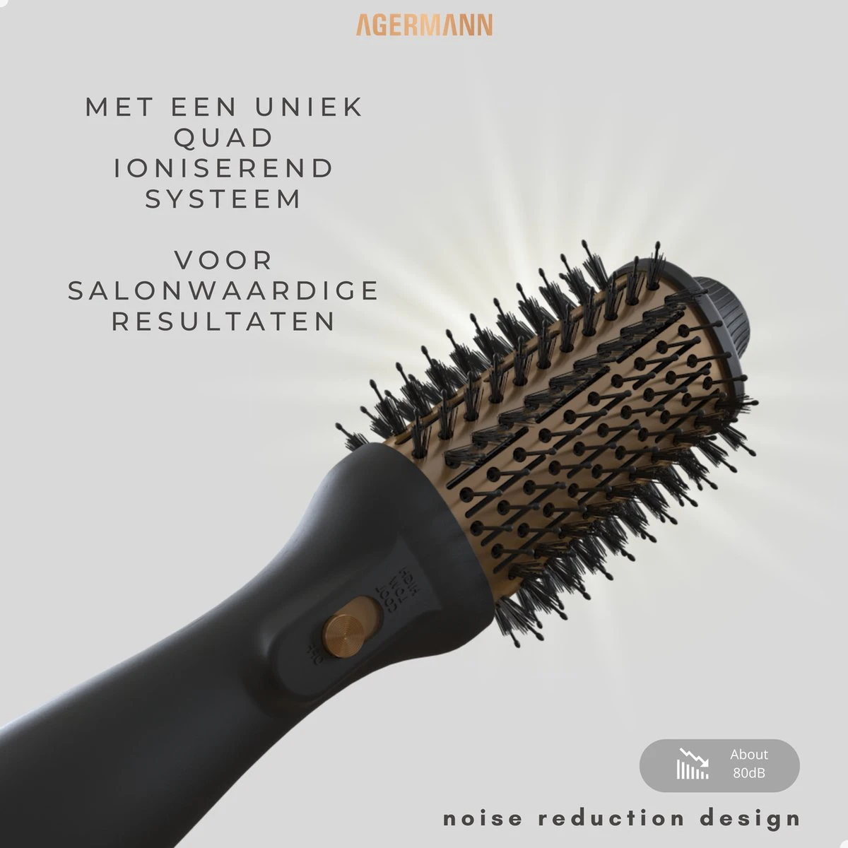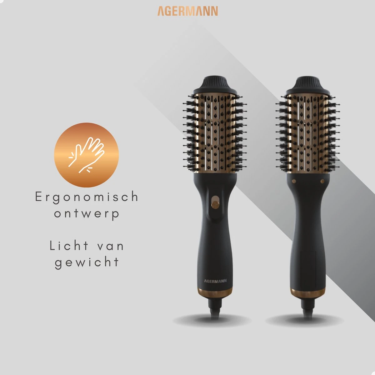 Agermann’s nieuw ontwikkelde Föhnborstel maakt gebruik van een nieuw ontwerp met de nieuwste technologieën. Föhn en Style je haar tegelijkertijd met de 4-in-1 föhnborstel. De borstel combineert een föhn, krulborstel, haarborstel en stijltang in één. Geschikt voor elk haartype, elke haardikte of voorkeur dankzij 3 blaasstanden, waaronder een koude-lucht stand. De föhnborstel droogt niet alleen het haar, maar voedt en verzorgt de haarwortels zelfs door de nieuwe technologiën. Halveer de tijd die je nodig hebt voor droog en glanzend haar zonder pluis met maximaal volume!