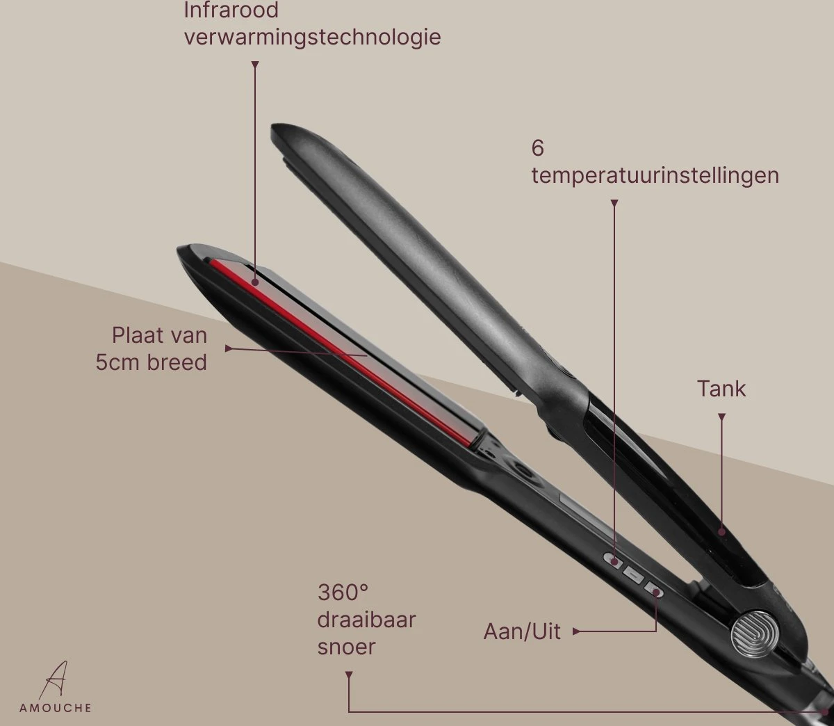 Wil jij ook een perfecte look creëren zonder urenlang te hoeven stoeien met je stijltang? Maak kennis met de Steampod van Amouche, de stoomstijltang die het stijlen van je haar makkelijker dan ooit maakt. Met deze innovatieve stijltang wordt het stijlen van je haar een fluitje van een cent en dat allemaal terwijl het hydrateert. De stoomgenerator van deze Steampod zorgt voor een gladde textuur en zorgt ervoor dat je haar maar liefst 80% minder beschadigd raakt dan met een traditionele stijltang. Of je nu een haartype hebt dat stevig en dik is of fijn en breekbaar, deze stijltang heeft voor elk haartype de juiste temperatuurinstelling. Transformeer je haar en creëer een adembenemende look met deze Steampod van Amouche.