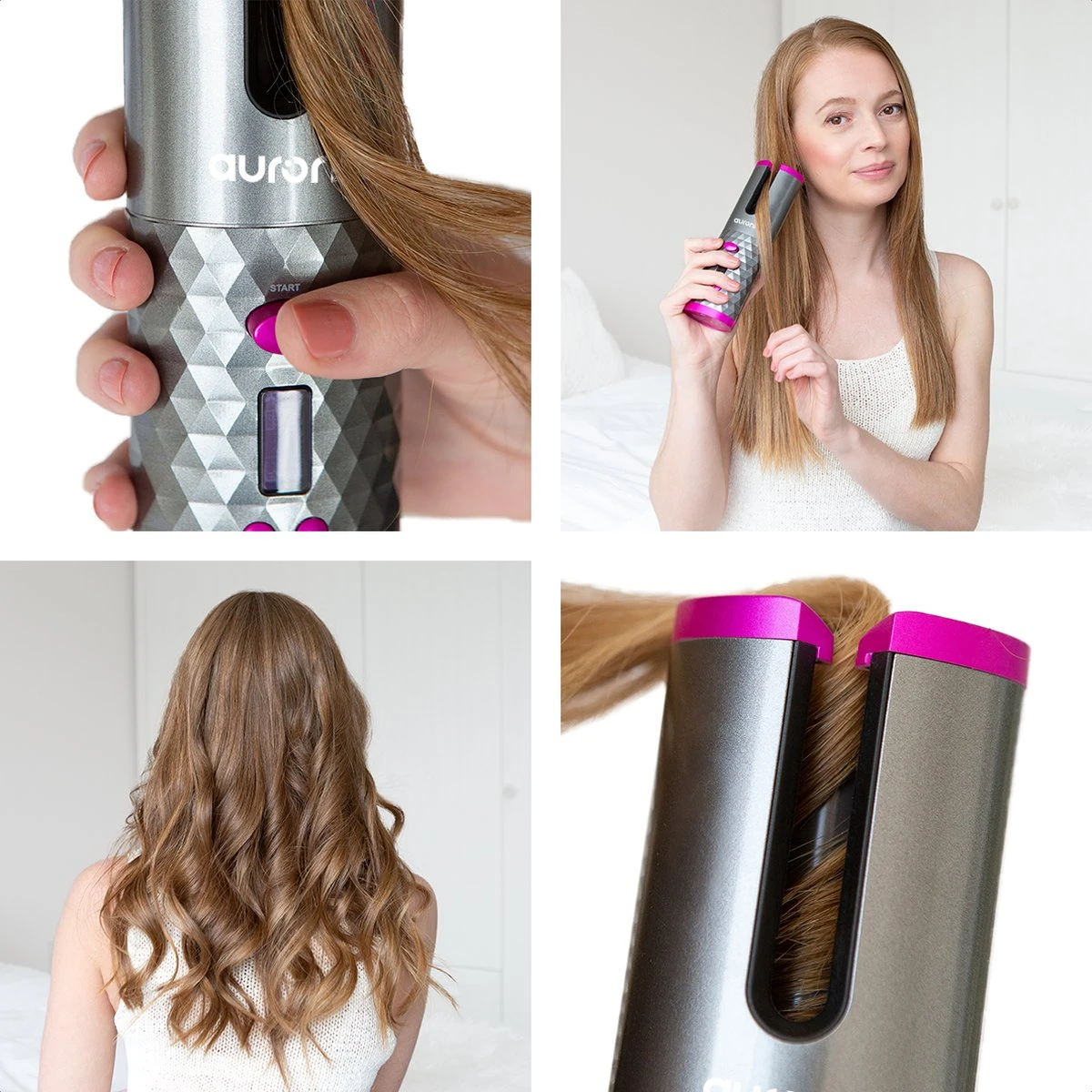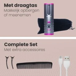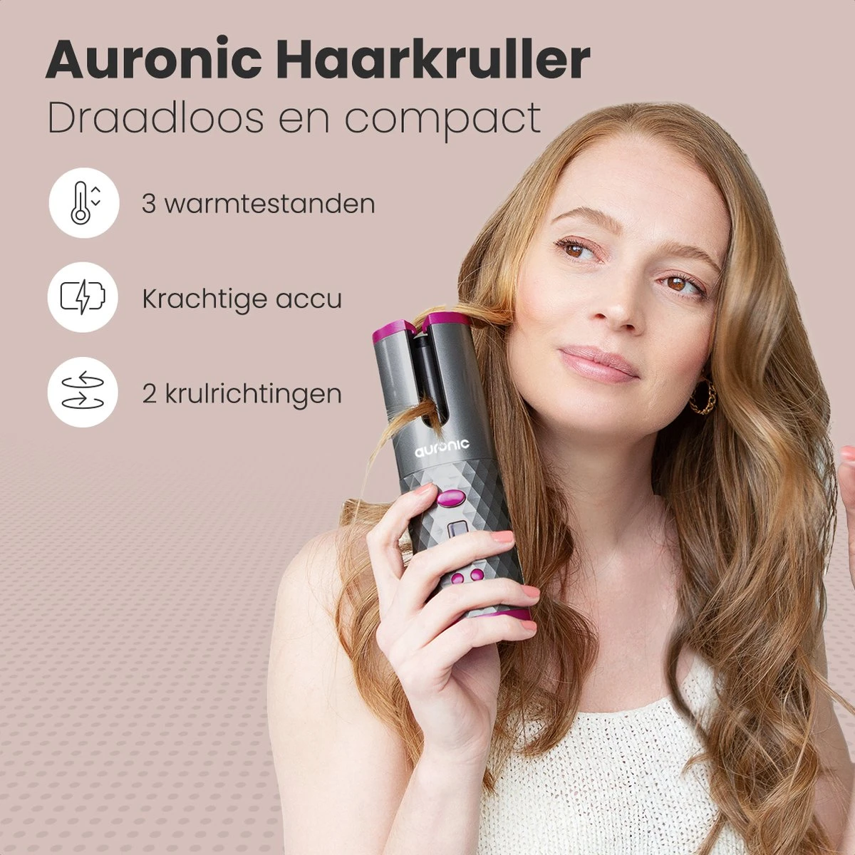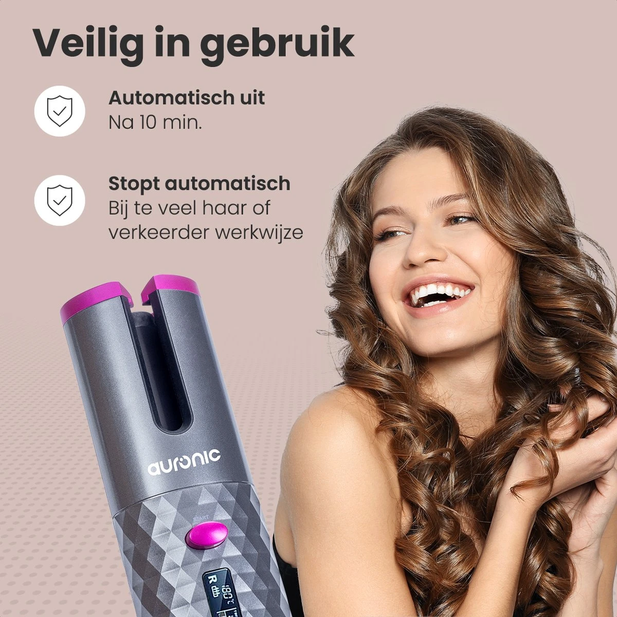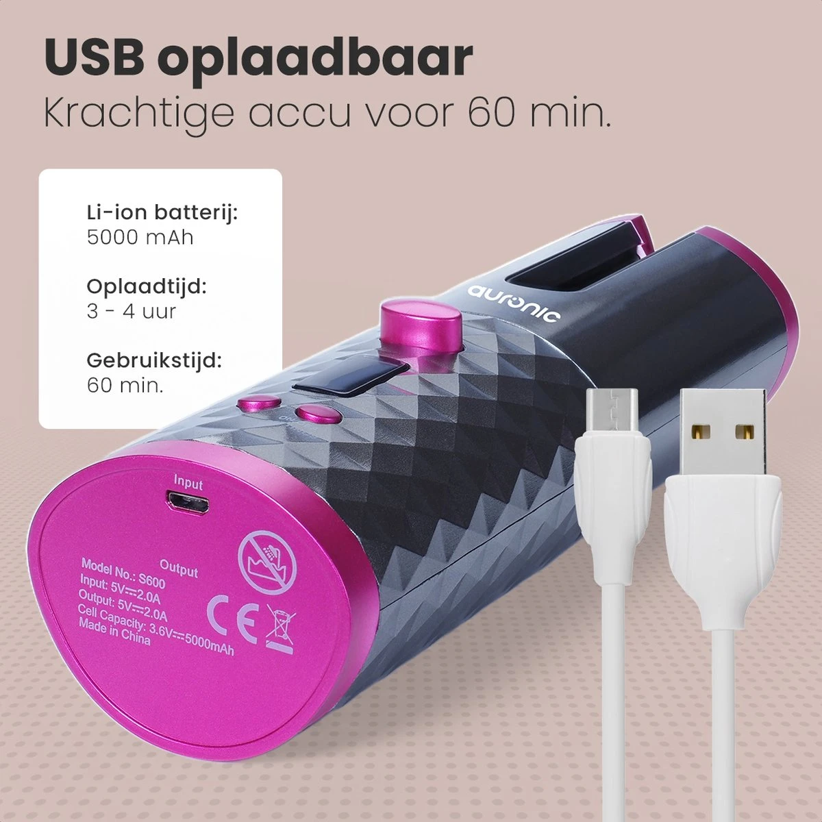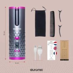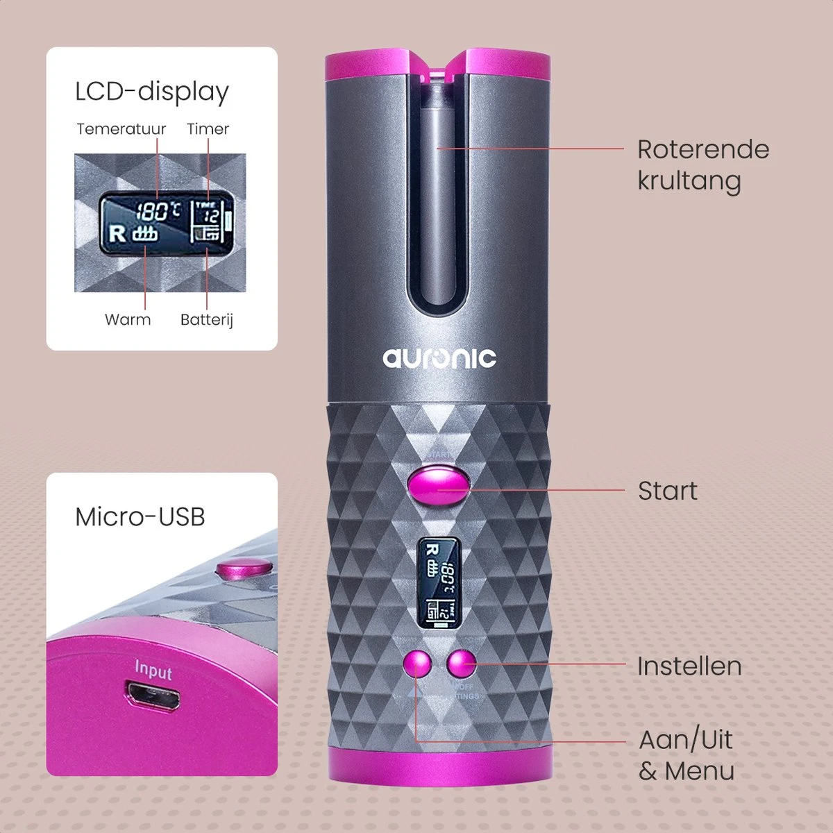 Altijd en overal mooie krullen? Neem de draadloze krultang van Auronic overal mee naartoe! Gebruik het LCD display om de temperatuur en de tijd in te stellen. Het krulijzer is USB oplaadbaar en zeer compact. Zelfs in een kleine handtas makkelijk mee te nemen! Dankzij de dubbele keramische isolatie is de kruller zeer veilig in gebruik. Je kunt zowel rechts- als linksom krullen. Je krijgt bij de krultang een handig draagtasje, een kam, krulspelden en een duidelijke handleiding. Een complete set voor de perfecte krul thuis, onderweg of op kantoor!