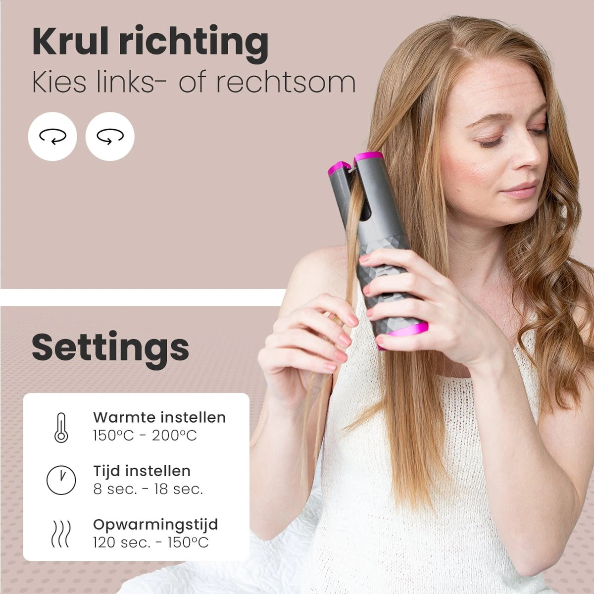 De krultang is ontzettend eenvoudig in gebruik. Pak een pluk haar, doe het in de kruller en druk op de grote roze knop. De kruller rolt automatisch je haar in het apparaat. Op het LCD display kun de tijd en temperatuur instellen. De kruller stopt automatisch na afloop van je instellingen. Creëer je favoriete haarstijl voor elke gelegenheid! De tijdsduur en temperatuur bepaalt het type krul. De kruller is geschikt voor ieder haartype en werkt het beste bij haar vanaf schouderlengte of langer.