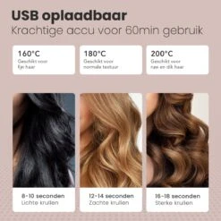 Je kunt de krultang volledig draadloos gebruiken. De ingebouwde accu laad je op met de meegeleverde micro-USB kabel. Met één oplaadbeurt kun je bij 180°C tot wel 60 minuten krullen! Binnen 4,5 uur is de krultang weer volledig opgeladen.