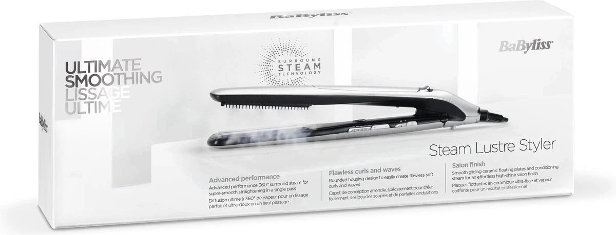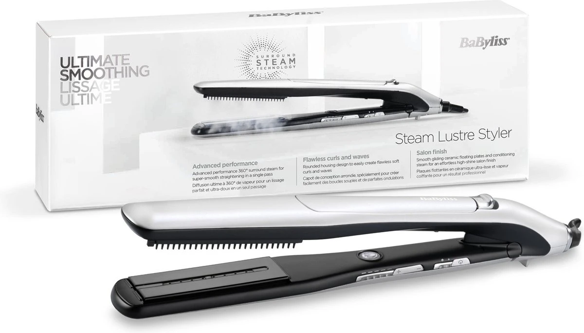 De BaByliss Steam Lustre Styler ST595E is dé ultieme stylingtool met stoom met tot wel 4g hoogglans stoomprestaties. De stoom dringt door het haar terwijl het Advanced Ceramics™ verwarmingssysteem zorgt voor een snelle warmteterugwinning voor gelijkmatige, gladde en glanzende resultaten. Stoom wordt onmiddellijk geactiveerd wanneer de platen worden gesloten, zo gaat er geen stoom verloren en hoef jij minder vaak het waterreservoir bij te vullen.