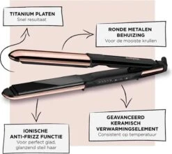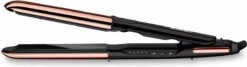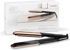 De Straight & Curl Brilliance Stijltang ST482E van BaByliss is de sterkste stijltang én 2 in 1 binnen de gehele collectie. Dit komt door het gebruik van twee materialen. Eén door titanium, want dit maakt de platen glad en sterker, waardoor ze beter bestand zijn tegen haarstylingsproducten én door de behuizing van RVS. Dit zorgt ervoor dat de platen, door de warmte, op den duur niet verbuigen. De platen blijven dus altijd mooi op elkaar aangesloten. Zo krijg je je haar in één keer mooi steil of gekruld. Krullen kan namelijk ook doordat de buitenkant van de stijltang ook wordt verwarmd. Pak de cooltips aan het uiteinde van de stijltang vast, zodat je het haar kan krullen.
