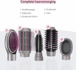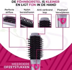 Met deze 5 in 1 föhnborstel is het mogelijk om haren te drogen en te stylen. De föhnborstel heeft 5 verwisselbare opzet stukken die gebruikt kunnen worden om het haar in het gewenste model te krijgen. De multistyler beschikt over de volgende opzetstukken: föhn, stijlborstel, twee verschillende maten krulborstels en een hoofdmassageborstel. De föhnborstel beschikt over 3 verschillende temperatuur- en blaasstanden met een perfect verdeelde luchtstroom (laag, medium en hoog). Hierdoor is de borstel geschikt voor ieder haartype en haardikte.
