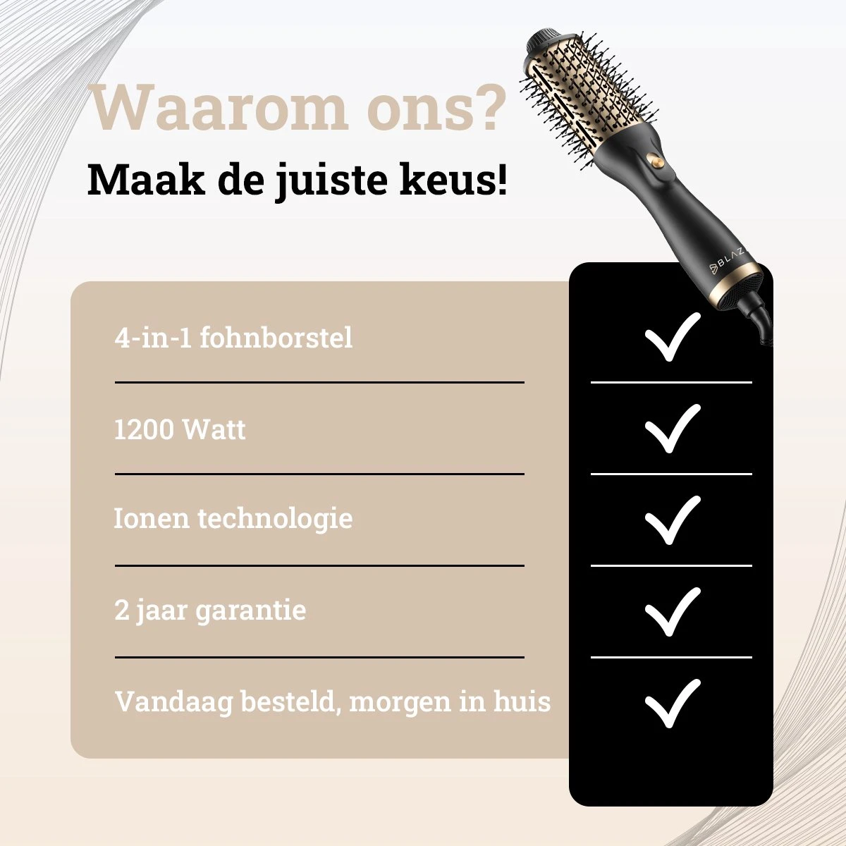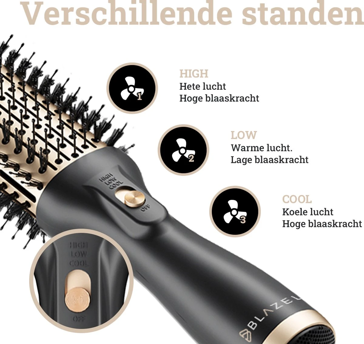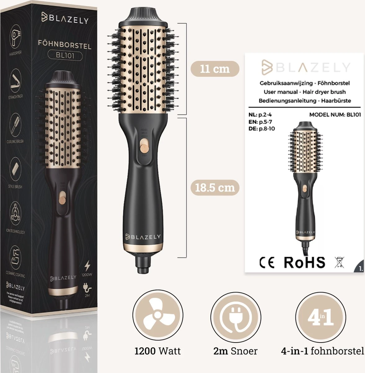 Waar anderen stoppen gaat Blazely verder, veel föhnborstels zijn slechts 3-in-1 maar de föhnborstel van blazely gaat een stapje verder. Namelijk een 4 in 1, zo kun je je haren föhnen, borstelen, stijlen en krullen. En dat allemaal met het gemak van slechts 1 apparaat. De tijd van 4 verschillende haartools is voorbij!