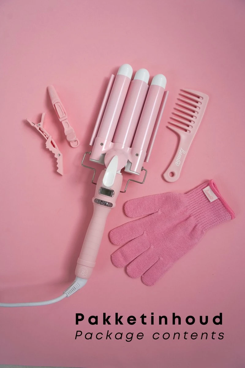 ♥ Inhoud verpakking: 1x Bombé krultang, 1x Bombé grove kam, 1x hittebestendige handschoen, 2x hairclips en 1x handleiding NL/ENG/DE/ES/FR