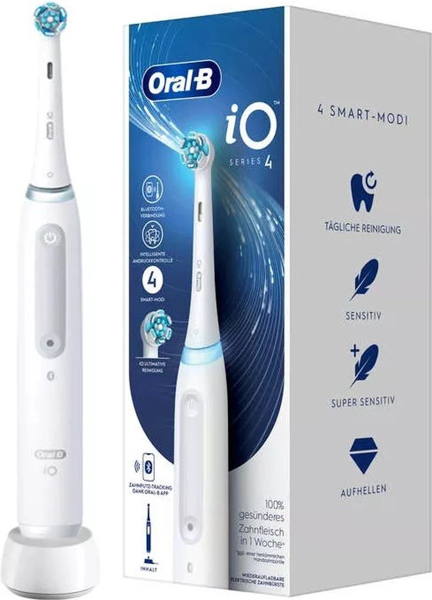 De iO 4 elektrische tandenborstel is voorzien van de beste technologie van Oral-B en combineert een door tandartsen geïnspireerde ronde borstelkop met micro-vibrerende borstelharen voor een professioneel reinigend gevoel thuis. De slimme poetsdruksensor helpt voorkomen dat u te hard of te zacht poetst om uw tandvlees beter te beschermen. Gum Guard waarschuwt u als u te veel druk op uw tanden uitoefent. Vervang uw Oral-B iO opzetborstel elke 3 maanden voor de beste resultaten.