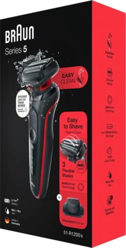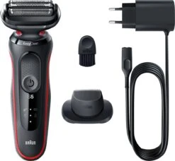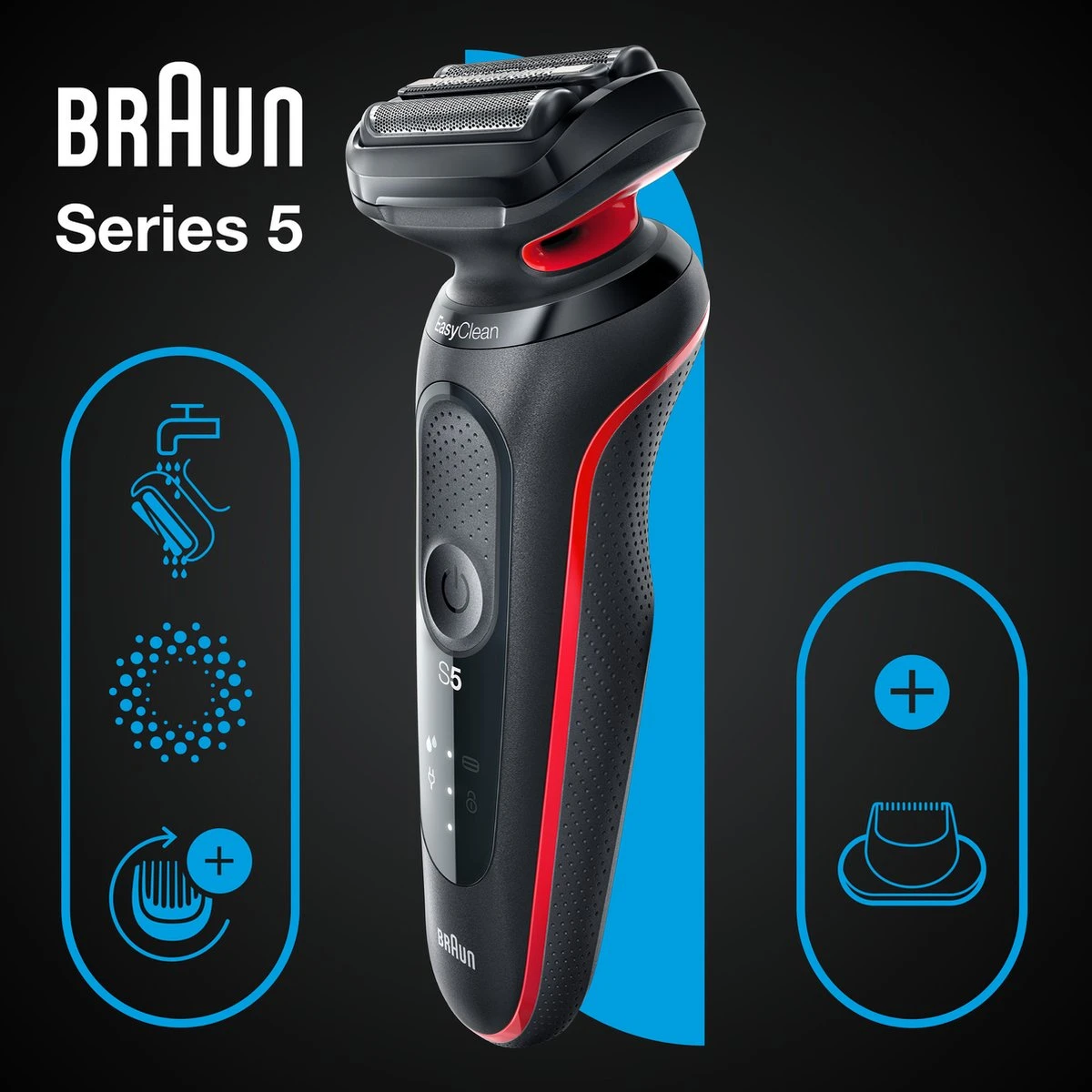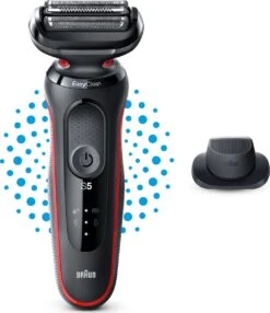 Het Braun Series 5 elektrisch scheerapparaat voor mannen maakt het scheren gemakkelijk met 3 flexibele mesjes die zich aan je gezichtscontouren aanpassen. Het EasyClean-systeem reinigt snel en eenvoudig zonder dat je de scheerkop moet verwijderen. Met de Li-Ionbatterij kun je je tot 3 weken scheren en 5 minuten opladen voor één scheerbeurt. Dit elektrische scheerapparaat voor mannen is 100% waterbestendig voor nat en droog gebruik. Compatibel met EasyClick om je scheerapparaat te upgraden. Doos bevat: 1x Series 5 elektrisch scheerapparaat voor mannen, 1x precisietrimmer opzetstuk, 1x beschermkapje, 1x Smart plug voor automatische aanpassing aan 100-240 voltage, 1x Reinigingsborsteltje