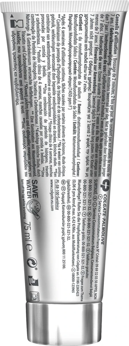 Met Colgate Max White Ultimate Whitening Tandpasta maak je je tanden op een veilige manier wit. De tandpasta verwijdert diepe vlekken op je tanden, veroorzaakt door eten, koffie, wijn en tabak.