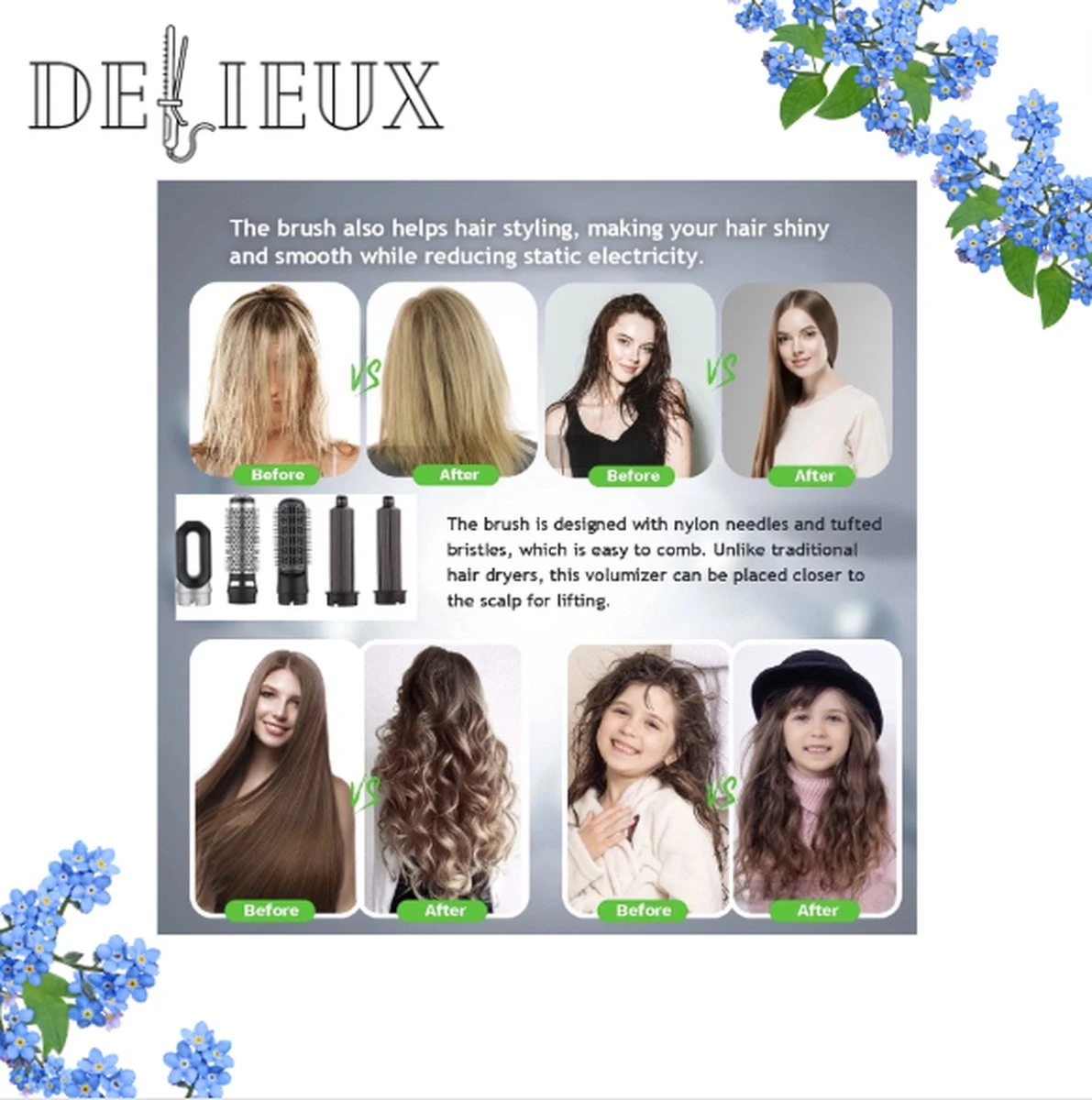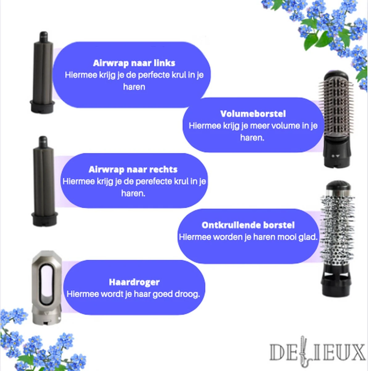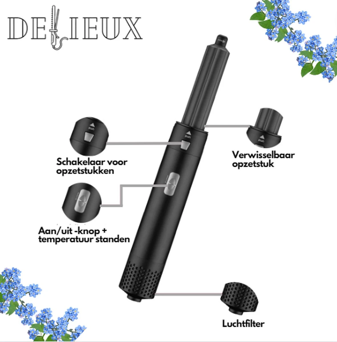 Delieux Airwrap is een 5 in 1 föhnborstel. Met deze föhn style jij jouw haar precies zoals dat jij dat wil in maar een paar minuten tijd! Dit wil toch iedereen? Door de vele opzetstukken kan jij