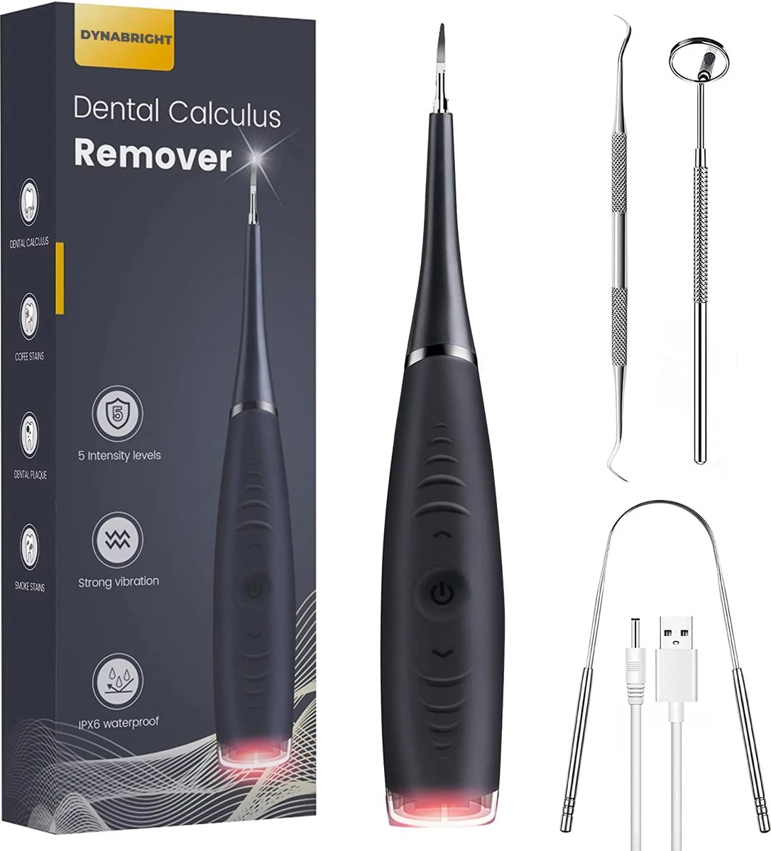 DynaBright Elektrische Tandsteen Verwijderaar – 5 Standen – 5 Delig – Incl. Professionele Tandarts Set – Tandplak – Zwart – Tong Schraper – USB – Tand Verzorging