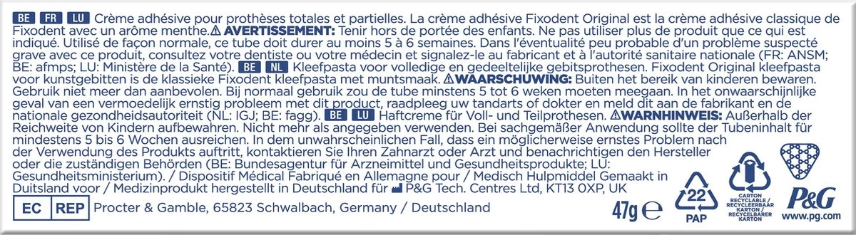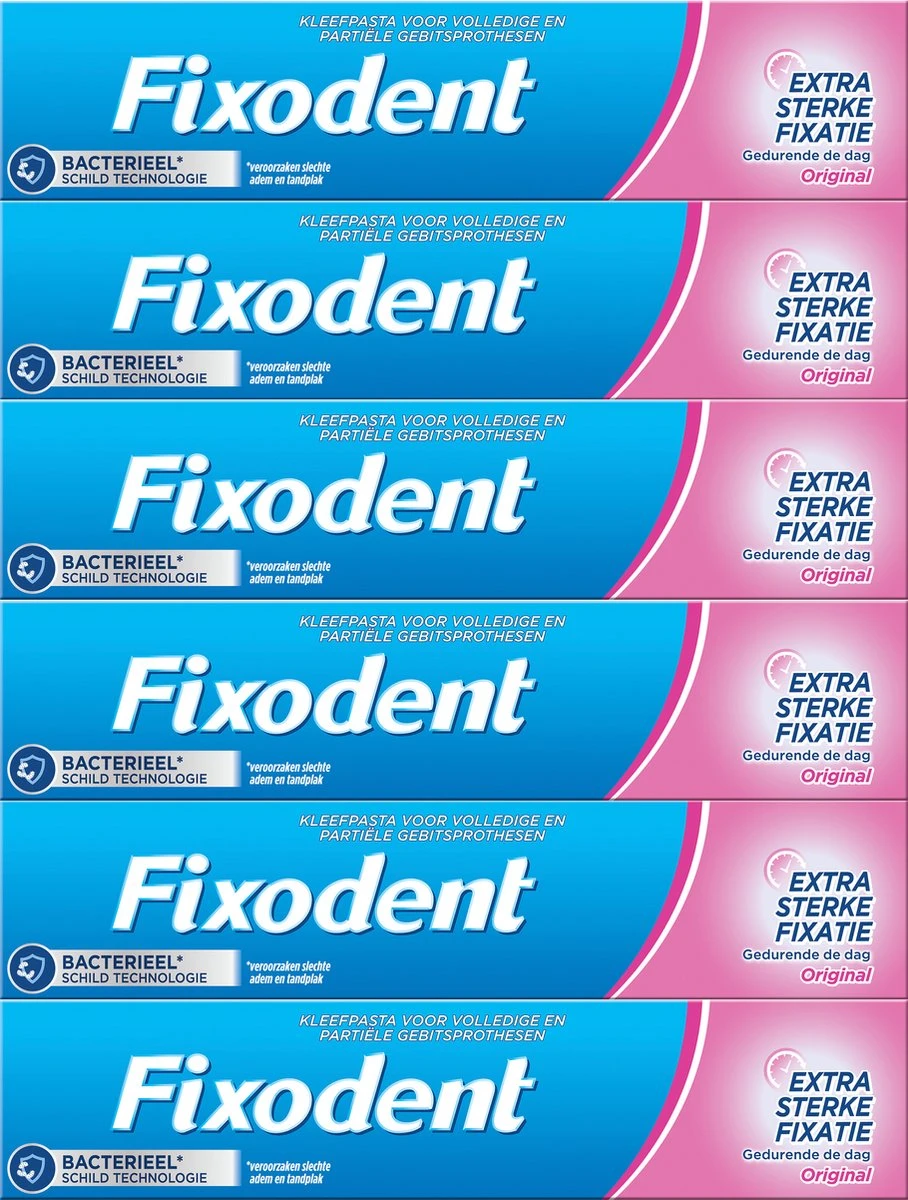 - Voor nog betere resultaten, bekijk het Fixodent-assortiment premium kleefpasta’s: Duo-Actie, Duo bescherming, Anti-voedselresten, 0%
