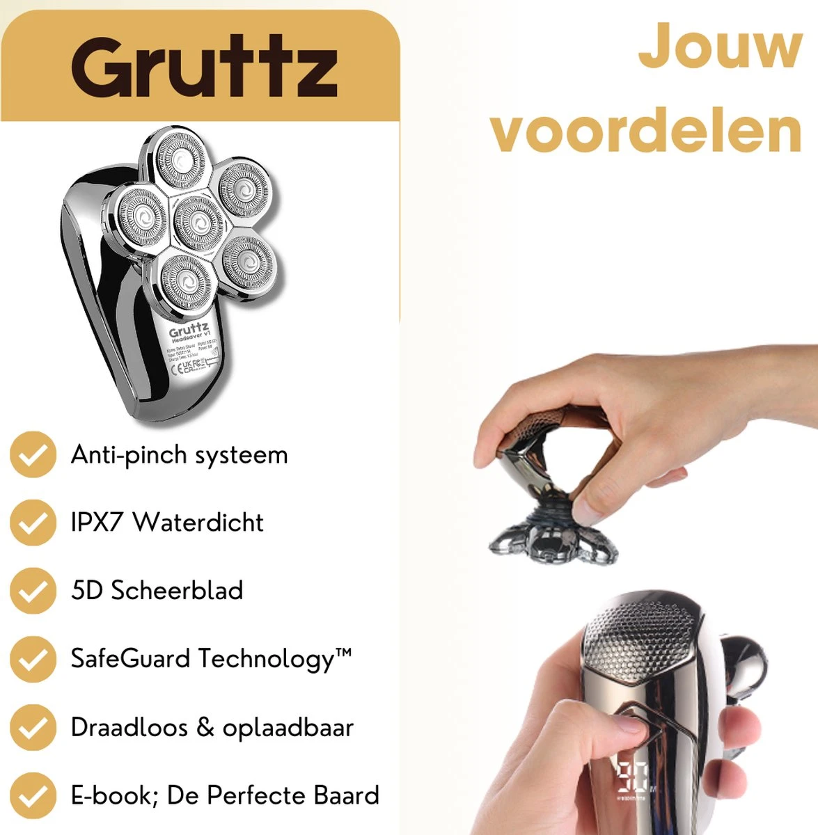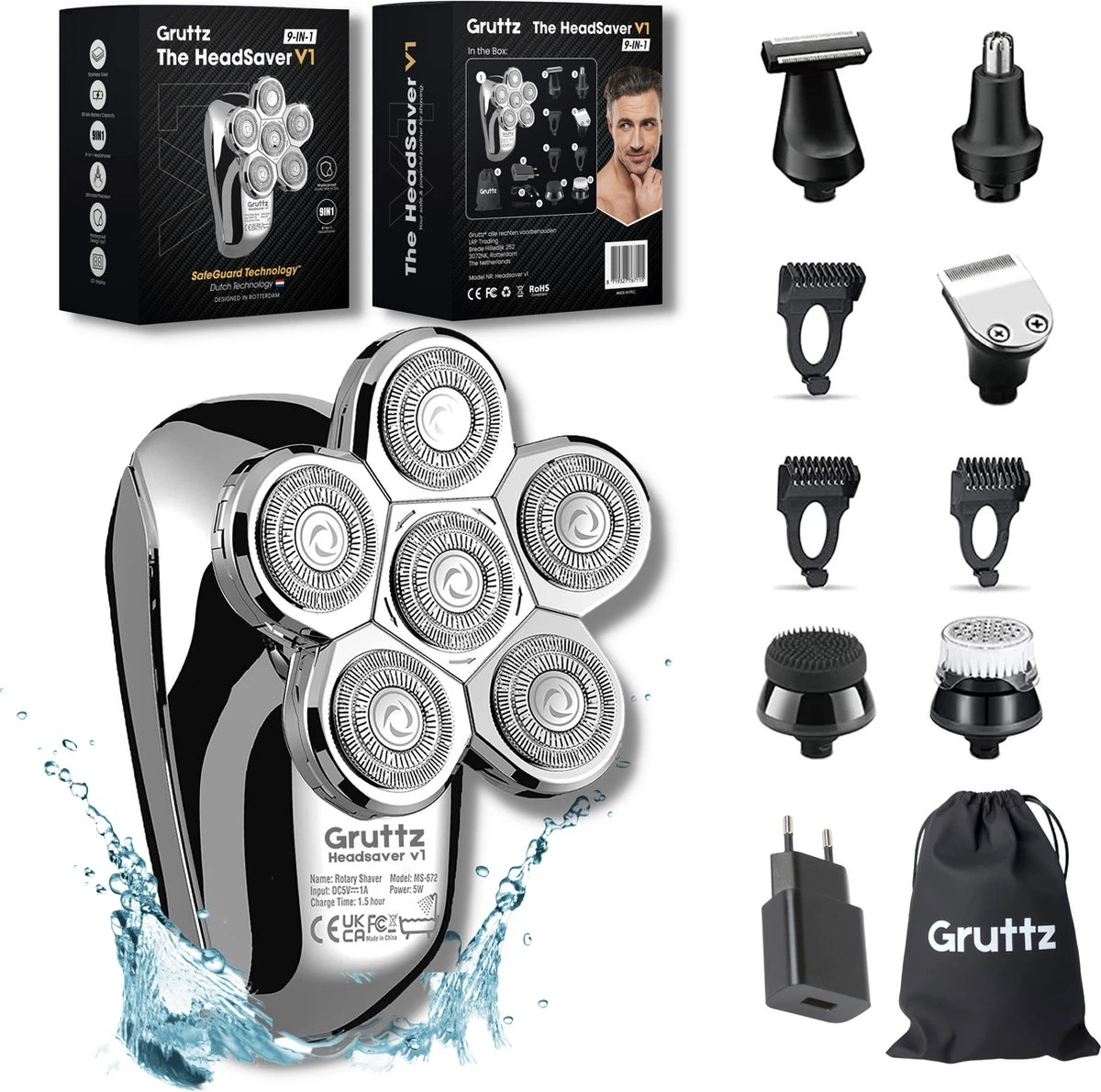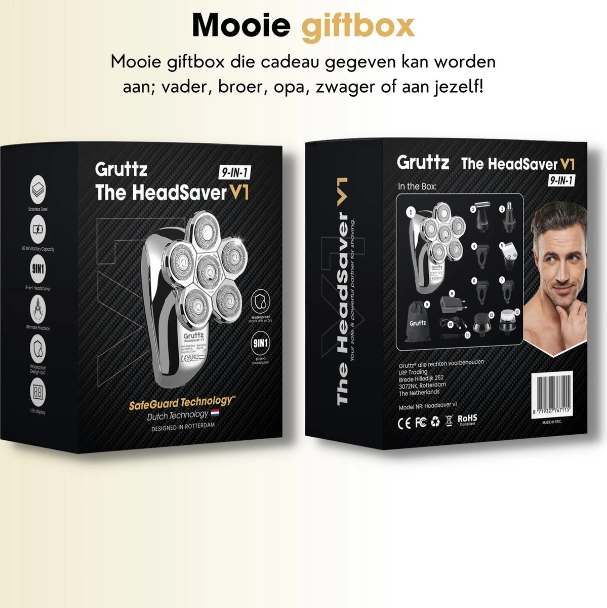 Zuinig zijn op je huid is een must, je krijgt er tenslotte maar één. Daarom is het van belang dat je een scheerapparaat hebt die jouw hierin volledig kan voorzien. Hij moet ten eerste krachtig genoeg zijn om te scheren, maar daarnaast moet hij natuurlijk ook veilig genoeg zijn dat je geen huidirritatie en/of snijwondjes krijgt van het scheren. Een verzorgde man telt voor twee. Althans, als het om zelfverzekerheid gaat en dat is waar wij mannen goed op gaan, toch? Dat begint bij een verzorgde baard en een goed geschoren hoofd. Scheren en trimmen, veilig en effciënt; dat kan nu allemaal met de 9-in-1 HeadSaver v1 van Gruttz®.