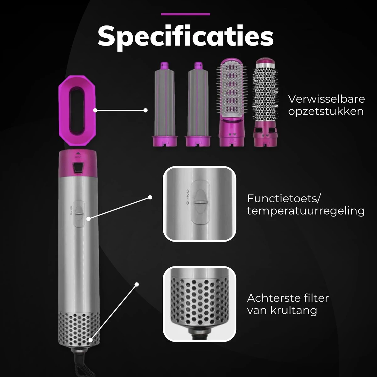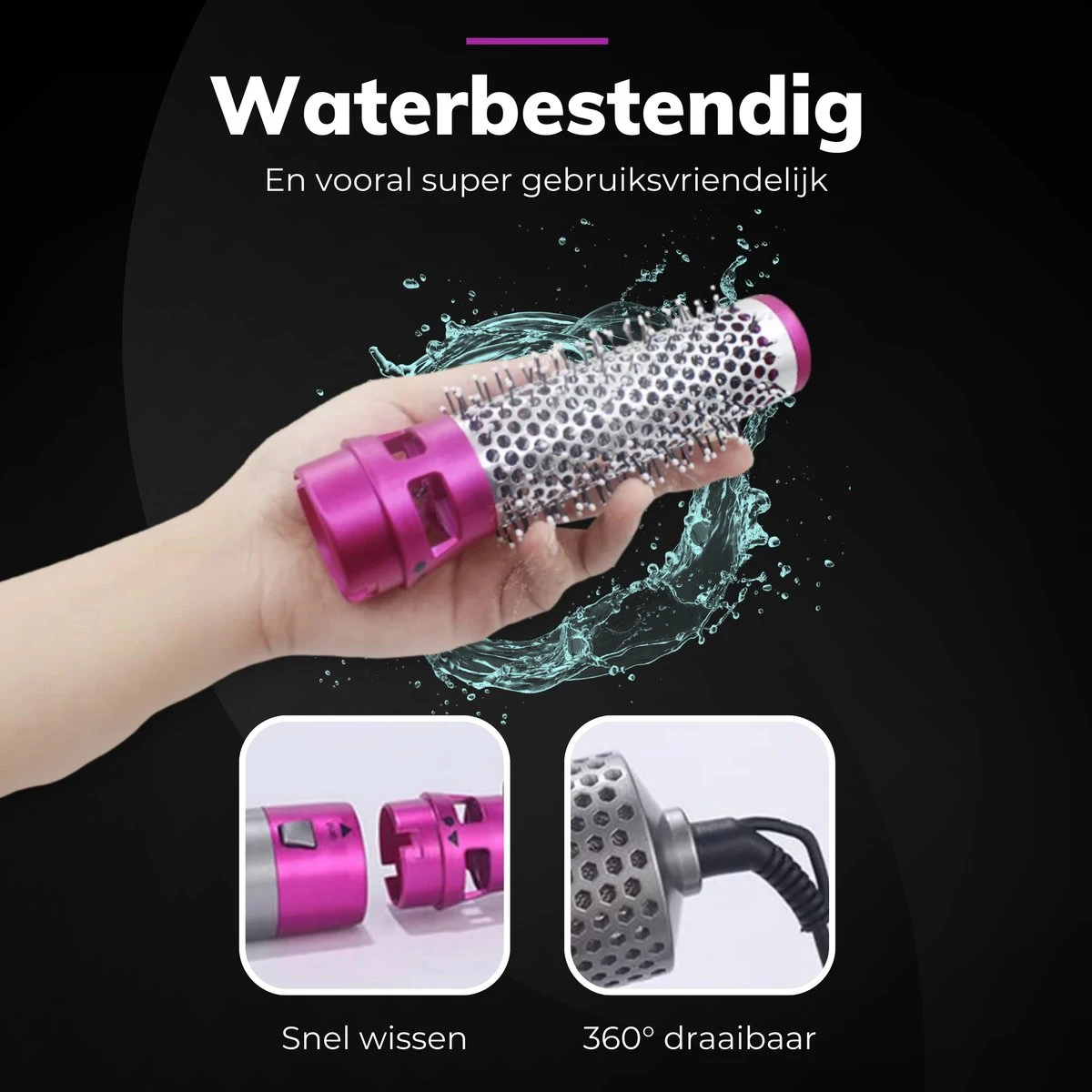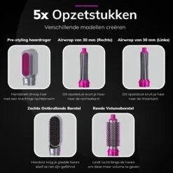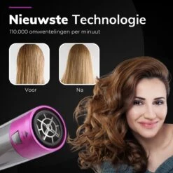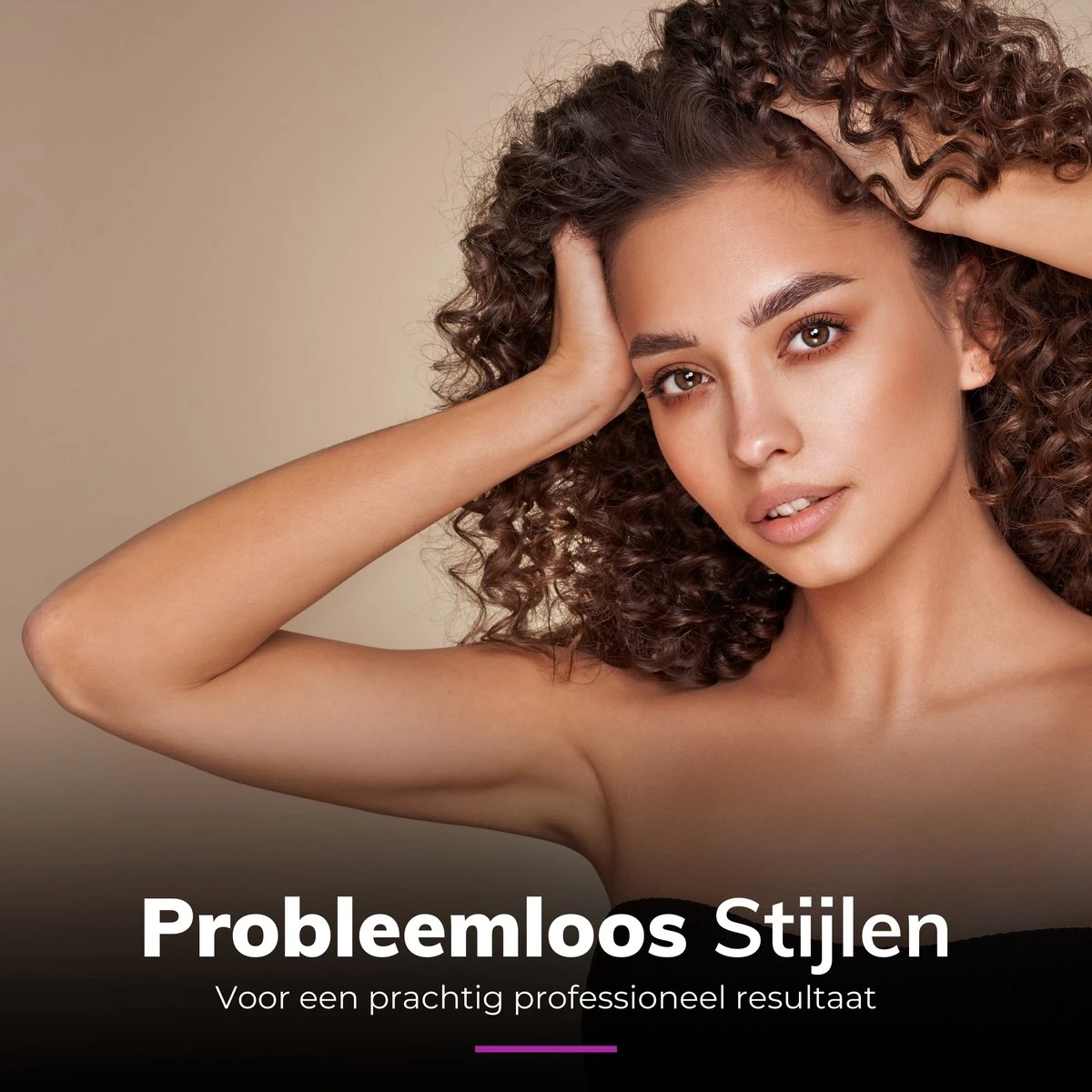 De draaikolk van de krultang trekt de haren automatisch aan en wikkelt ze om het opzetstuk waardoor jouw haren een prachtige gekrulde vorm krijgen. Hierdoor hoef jij zelf niet lastig pluk voor pluk het haar om de krultang te draaien maar wordt dit voor jou gedaan. Voor het maken van de krullen zijn er 2 opzetstukken waarbij bij de één de luchtstroming linksom draait en de ander rechtsom. Daarnaast maak jij met de föhnborstel je haar prachtig glad voor het stijlen om de hele dag het haar fantastisch in model te hebben.