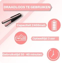 LET OP: De stijltang wordt minder warm dan een stijltang die in de stopcontact moet. Laat het eerst goed opwarmen, tot het licht blijft branden en niet knippert.