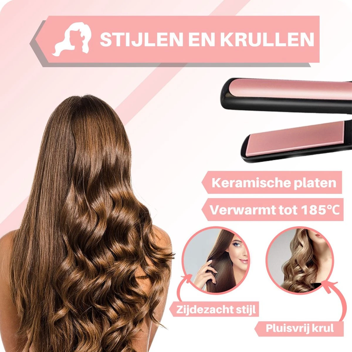 De stijltang is geschikt voor het stijlen en krullen van kort, lang, dun, slag en golvend haar. Zo ben je altijd verzekerd dat je haar last minute perfect zit!