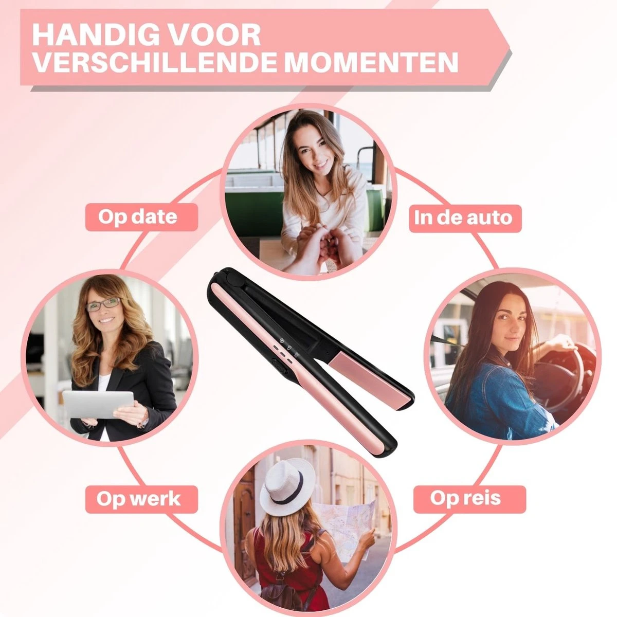 De stijltang heeft een handig formaat en lichtgewicht om overal mee naartoe te nemen in een handtas, rugzak of handbagege. Zo kun je overal je haren stijlen of krullen. De laatste check vindt namelijk nog in de auto of in het openbaar vervoer plaats. Ook is het handig om tijdens het reizen naar het buitenland mee te nemen. De draadloze stijltang is een lifesaver.