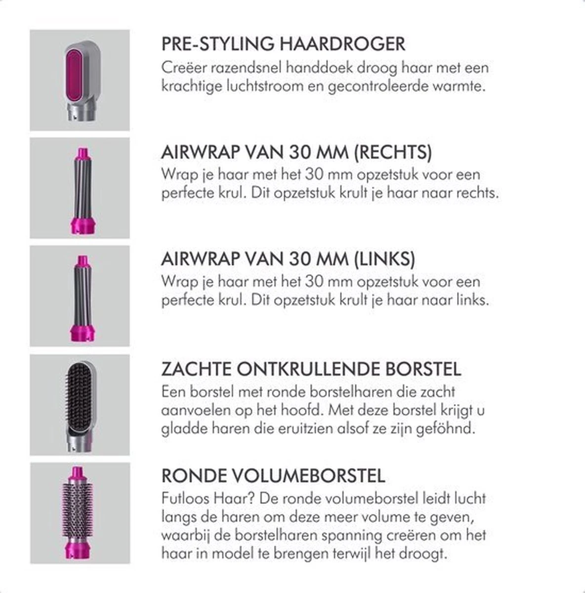 Wil jij ook de perfecte krul, mooi golvend haar of juist super stijl haar, dan is de 5 in 1 Airwrap van Kess® echt iets voor jou! Binnen no time heb je het gewenste resultaat met de 5 meegeleverde opzetstukken. Niet meer de deur uit naar de kapper maar gewoon thuis voor de spiegel!