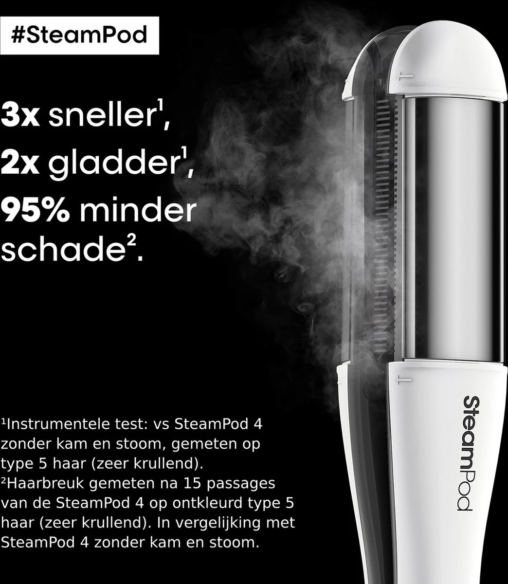 L’Oréal Professionnel SteamPod 4 is dé stoomstijltang die alles kan, geschikt voor alle haartypes en brengt tot wél 95% minder schade aan het haar²!