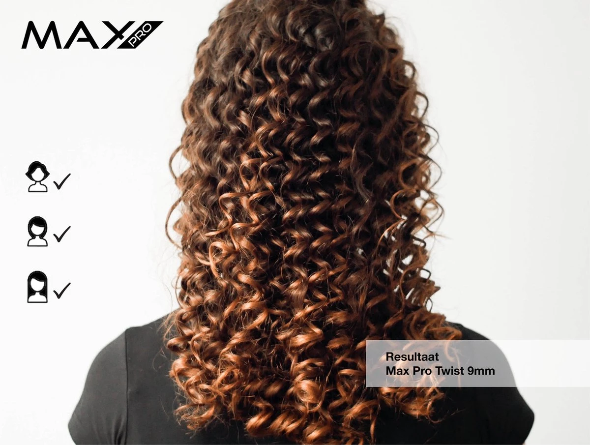 De keramische staaf van 19mm maakt krullen met een diameter van 19mm. Ten opzichte van de Max Pro Twist Krultang 25mm zijn deze krullen kleiner. Deze krultang is daarom perfect voor een volle bos met veel krullen.