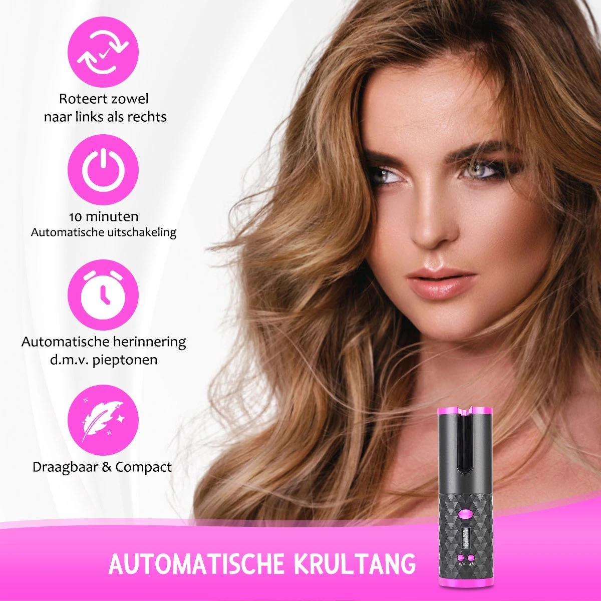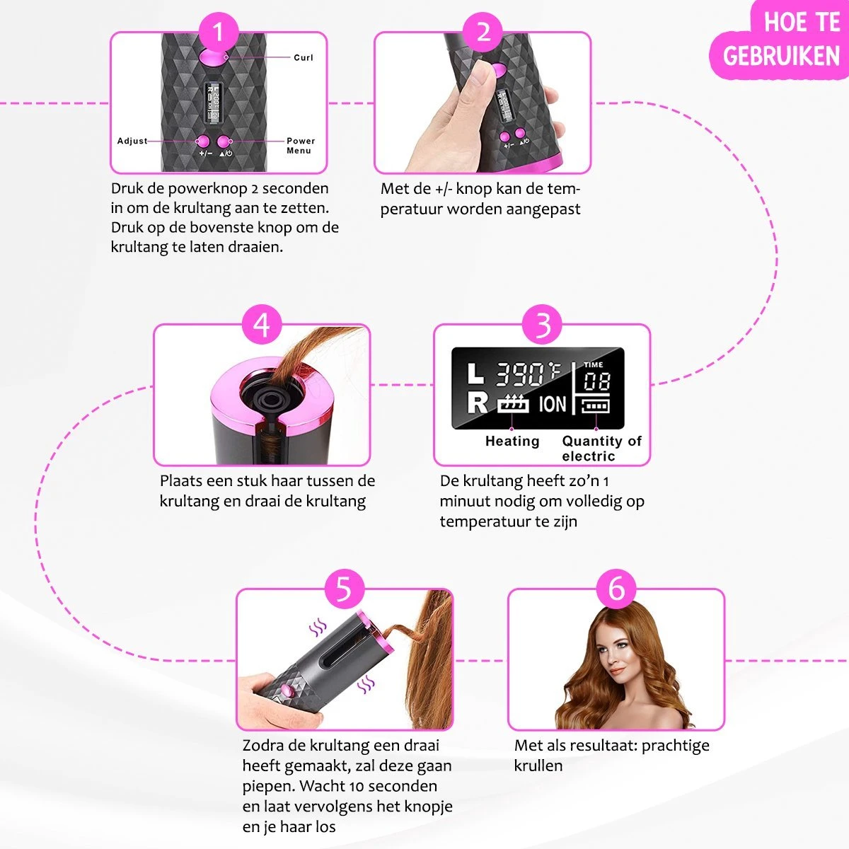 Mooie krullen, wie droomt er niet van? Wel, ook voor jou zijn veerkrachtige, glanzende krullen perfect haalbaar. En nee, dat hoeft geen uren te kosten! Met de draadloze haarkruller zorg je in slechts luttele minuten voor prachtige krullen. Deze krultang is makkelijk in gebruik handig draagbaar. Schitterende krullen, gelijk waar en wanneer!