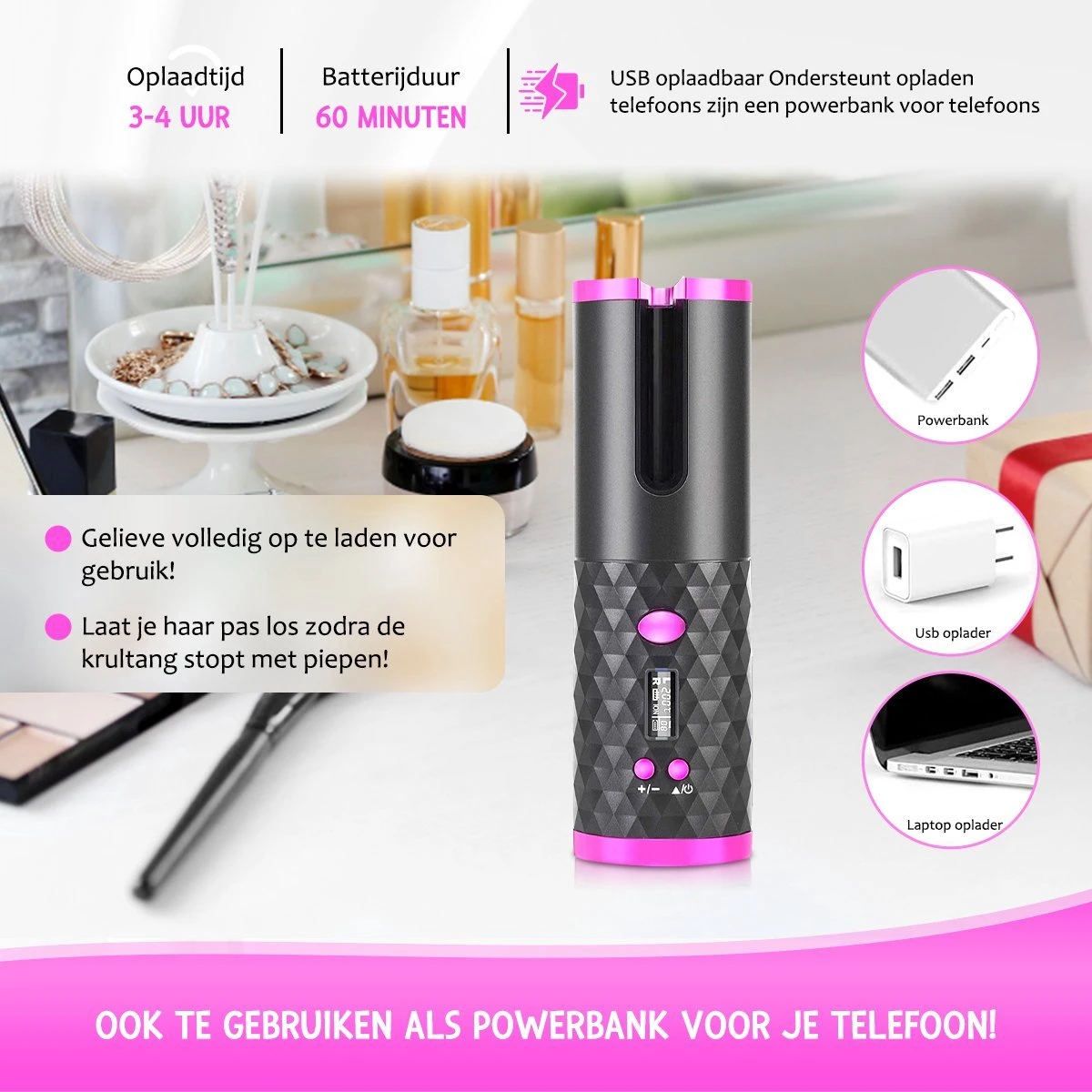 De lithium-ionbatterij van 2500 mah zorgt voor een opgeladen batterij in 40 minuten tijd. Vervolgens kun je een hele tijd verder. De krultang valt perfect met USB op te laden. Gelijk waar en wanneer prachtige krullen!