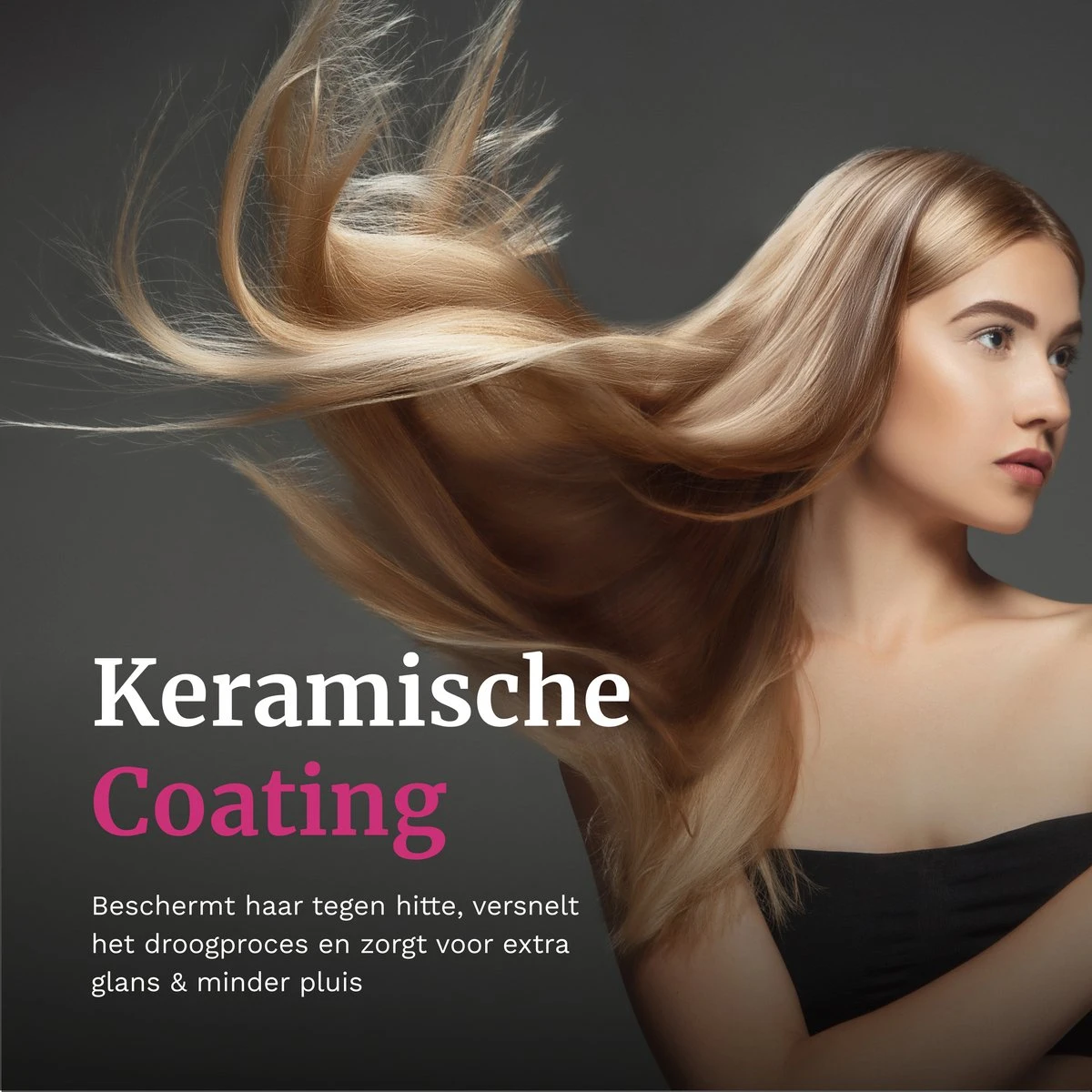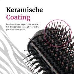 De föhnborstel heeft een keramische coating, wat je haar beschermd tegen uitdrogen. De coating zorgt dat de warmte gelijkmatig over de gehele haarborstel verspreid wordt. Het beschermt je haar daarnaast tegen de directe hitte van het warmte-element. Hierdoor kan de warme lucht je haar langzaam doordringen en van binnen naar buiten verwarmen zonder je haar te beschadigen.