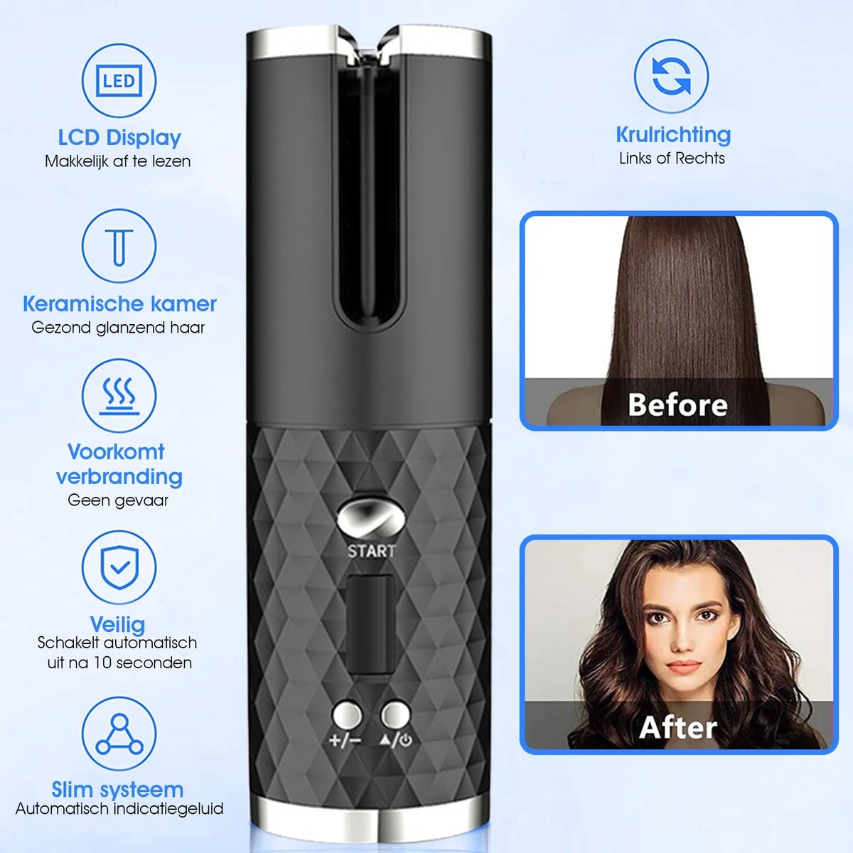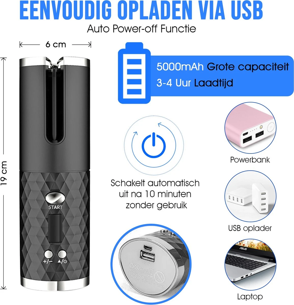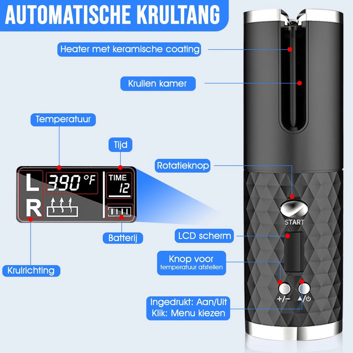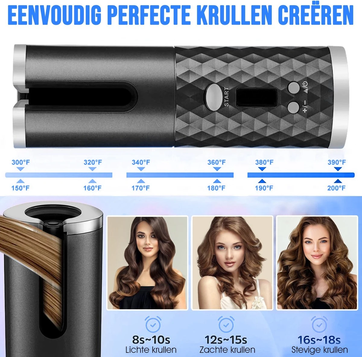 - HD LCD scherm waarop temperatuur, tijd, krulrichting en accuduur af te lezen is