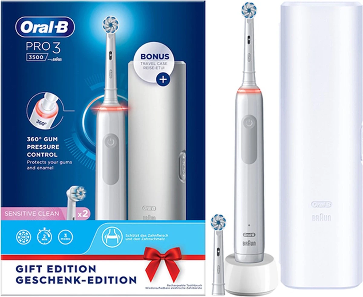 De Oral-B PRO 3 elektrische tandenborstel heeft een krachtige motor met 40.000 pulsaties en 8.800 rotaties per minuut. De ingebouwde poetsdruksensor en timer zorgen tijdens het poetsen voor extra ondersteuning. De 360° poetsdrukcontrole waarschuwt je direct wanneer je te hard poetst. De rand licht rood op en de tandenborstel gaat automatisch zachter draaien. Op deze manier worden je tanden en tandvlees beschermd tegen beschadigingen.