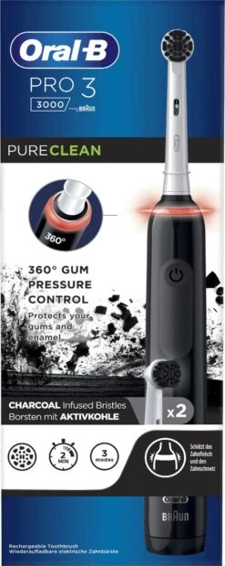 De Oral-B Pro 3 heeft een ronde opzetborstel die elke tand omsluit voor schonere tanden en gezonder tandvlees; hij verwijdert tot 100% meer tandplak dan een handtandenborstel.