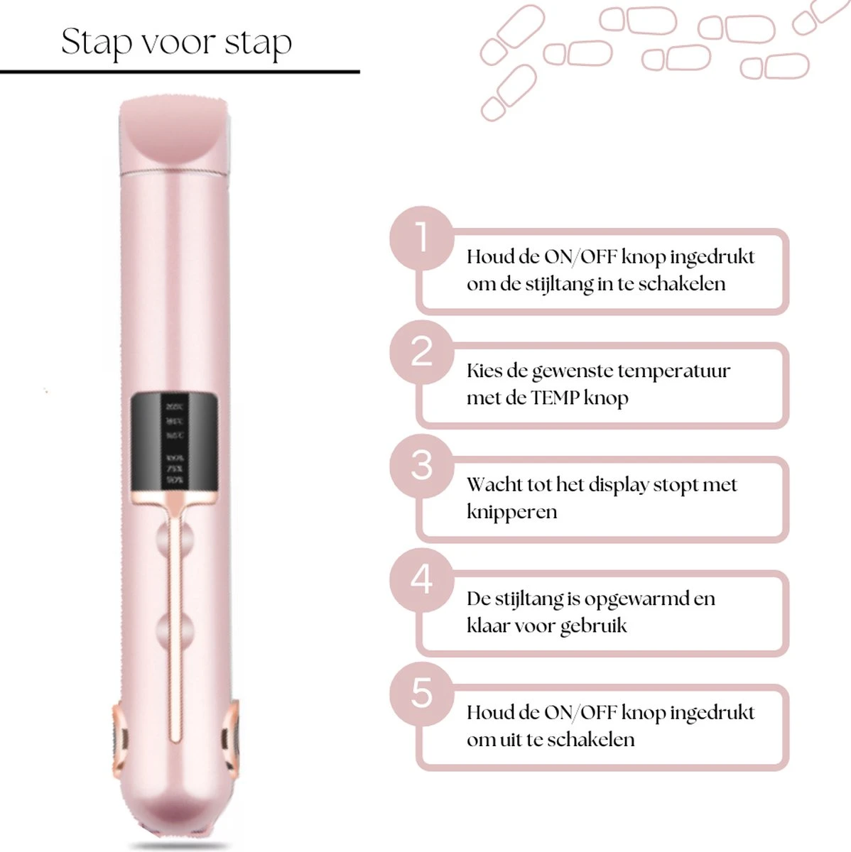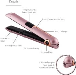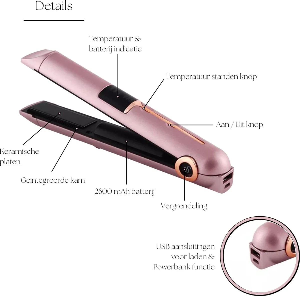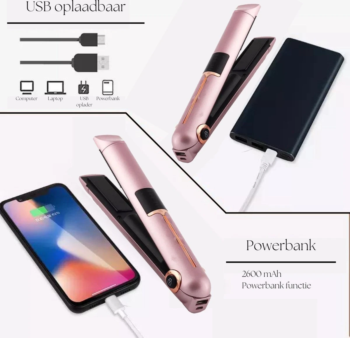 Omdat de stijltang draadloos is ben je niet afhankelijk van een stopcontact. De stijltang beschikt namelijk over een 2600mAh accu. Deze kan ook als powerbank functie gebruikt worden om bijvoorbeeld je telefoon op te laden. Doordat deze stijltang opgeladen wordt via USB kun je ook nog eens de accu via diverse manieren opladen. Denk hierbij aan laptop, powerbank, autolader, zonnepaneel of andere USB voedingen. Ideaal voor als je onderweg, op reis of op een festival bent bijvoorbeeld.