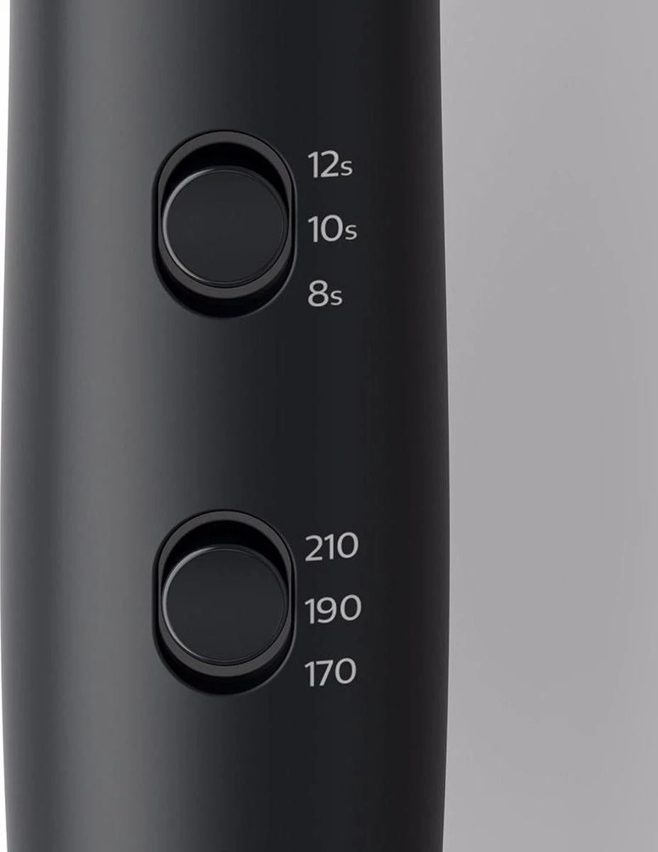 Met de 3 temperatuurstanden (170 °C – 190 °C – 210 °C) en 3 timerinstellingen (12 sec – 10 sec – 8 sec) behaal je geweldige resultaten, van losse tot strakke krullen bij verschillende haartypen. Met de hoge temperatuurinstelling en de extra krultijd kun je bijvoorbeeld strakkere krullen maken – ideaal voor dikker haar. De lage temperatuurinstelling in combinatie met een kortere krultijd is ideaal voor haar dat extra bescherming nodig heeft.