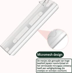 Onze specialistische precisiescheermesjes verwijderen gemakkelijk ongewenst haar op alle delen van het gezicht. Zowel op het voorhoofd, de wangen, de lippen en de kin. Het ‘narrow netted’ design van onze scheermesjes heeft een extra veiligheidslaag en dit voorkomt sneetjes. Door het ergonomische design ligt het mesje goed in de handpalm en door de antislip strip, glijdt het niet uit je handen.
