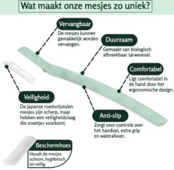 De mesjes in de scheermesjes zijn gemaakt van hoge-kwaliteit Japans roestvrij staal. Japans staal heeft vaak een hogere hardheid (HRC) en hierdoor blijven de mesjes langer scherp. Mocht het mesje na enige tijd toch toe zijn aan vervanging, dan is dit geen probleem want bij elke set zitten 6 extra mesjes. Met een totaal van 12 hoogwaardige kwaliteit mesjes kun je dus wel even vooruit!