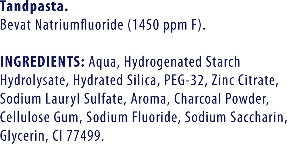 Prodent Long Active™ Nature Elements Charcoal White & Detox voor een natuurlijke witte lach en een schone mond. De tandpasta zorgt voor vlekverwijdering en wittere tanden. Met houtskoolpoeder bekend door diepe reinigingseigenschappen. Kies Prodent Long Active Nature Elements voor het hele gezin, voor een complete langdurige tandbescherming. Tandplak wordt veroorzaakt door bacteriën. Onze milde formule combineert houtskoolpoeder met het zink mineraal. De natuurlijke antibacteriële werking van zink zorgt voor een anti-tandplak effect tot wel 24 uur*. Wist je dat zuuraanvallen veroorzaakt door tandplak-bacteriën in je mond toenemen na eten en drinken? Prodent Long Active™ beschermt de tanden de hele dag, tussen de dagelijkse poetsbeurten door. Tips om tandplak en tandsteen te voorkomen: Naast het gebruiken van Prodent Long Active™. -Poets je tanden twee keer per dag zorgvuldig met fluoride-tandpasta gedurende minimaal twee minuten per keer. Prodent Long Active™ bevat zowel fluoride als andere actieve ingrediënten die tandplak helpen voorkomen. -Gebruik een zachte tot medium tandenborstel, zoals de Prodent Ultra Reach. -Floss iedere dag – dit is cruciaal dus laat je niet verleiden deze stap over te slaan, zelfs als je haast hebt. -Spoel met een mondwater met fluoride. -Ga elk half jaar naar je tandarts en/of mondhygiënist om alle tandsteen dat mogelijk gevormd is te laten verwijderen. Tandpasta. Bevat Natriumfluoride (1450 ppm F). Gebruik voor kinderen van zes jaar of jonger niet meer tandpasta dan de grootte van een erwt. Zorg dat ze zo weinig mogelijk tandpasta inslikken. Raadpleeg een (tand) arts als uw kind fluoride in een andere vorm gebruikt. *Bij twee keer poetsen per dag.