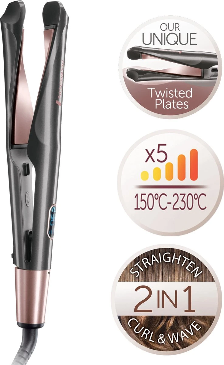 - Digitale temperatuurstand: 5 temperatuurinstellingen van 150-230 ºC. Geschikt voor alle haartypen.