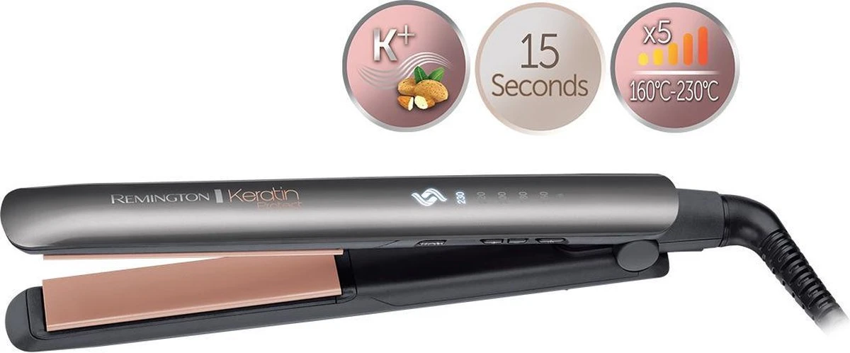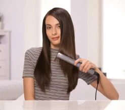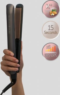De geavanceerde keramische platen, stijlvol vormgegeven in lichtgrijs en roségoud, zijn verrijkt met keratine en amandelolie voor zacht, glanzend en vitaal haar en zorgeloze dagelijkse styling. Creëer een unieke én gezonde salonlook die langer blijft zitten, zonder risico op beschadigingen.