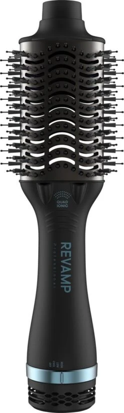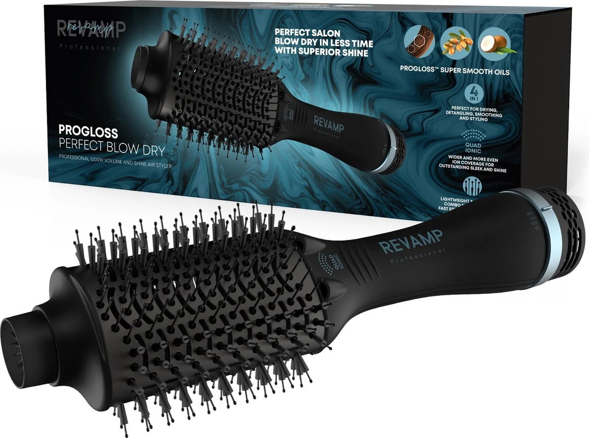 Krachtig drogen en stylen gecombineerd in één simpele haartool. De Revamp Progloss Perfect Blow Dry Volume and Shine Air Styler droogt, ontwart, verzacht en stylet je haar in slechts één beweging. De ovale keramische cilinder van de borstel werkt om het haar glad te maken en te stylen, terwijl de afgeronde randen volume toevoegen aan de wortel, zodat je thuis een föhn van salonkwaliteit kunt creëren. Om een ​​pluisvrije styling te garanderen, heeft deze multifunctionele styler 4 ionische jetstralers en een keramische cilinder. Pas je stylingervaring aan met 3 Heat/Speed-instellingen, inclusief een Cool-optie om je kapsels op hun plaats te houden. Het lichtgewicht ontwerp en de 3 m lange salonkabel zorgen voor een snelle en gemakkelijke styling, met extra flexibiliteit. Doordrenkt met Progloss supergladde oliën voor verbeterde glans.