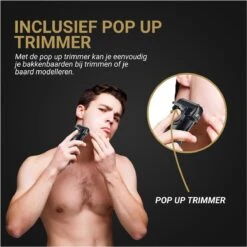 Met de ingebouwde trimmer kunt u gemakkelijk de langere haren verwijderen, uw baard meer definitie geven en uw bakkebaarden scheren. U klikt hiervoor op het aangegeven knopje aan de achterkant en de trimmer popt eruit.