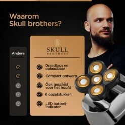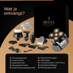 - 6-in-1 – Het scheerapparaat van Skull Brothers® bezit over meerdere opzetstukken en heeft 6 verschillende functies van scheren en trimmen. Zorg voor een stralende en schone huid!