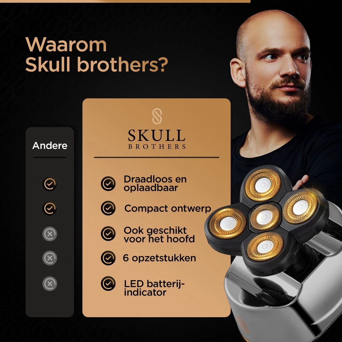 Bestel vandaag nog het scheerapparaat van Skull Brothers® en ga voor een gladde en zachte huid zonder pijn of moeite!