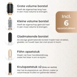 - 6 opzetstukken (2x krul, grote en kleine volumeborstel, fohn opzetstuk, gladmakende borstel)