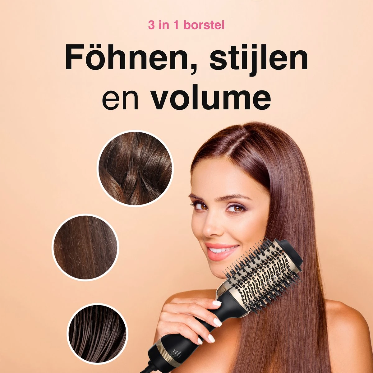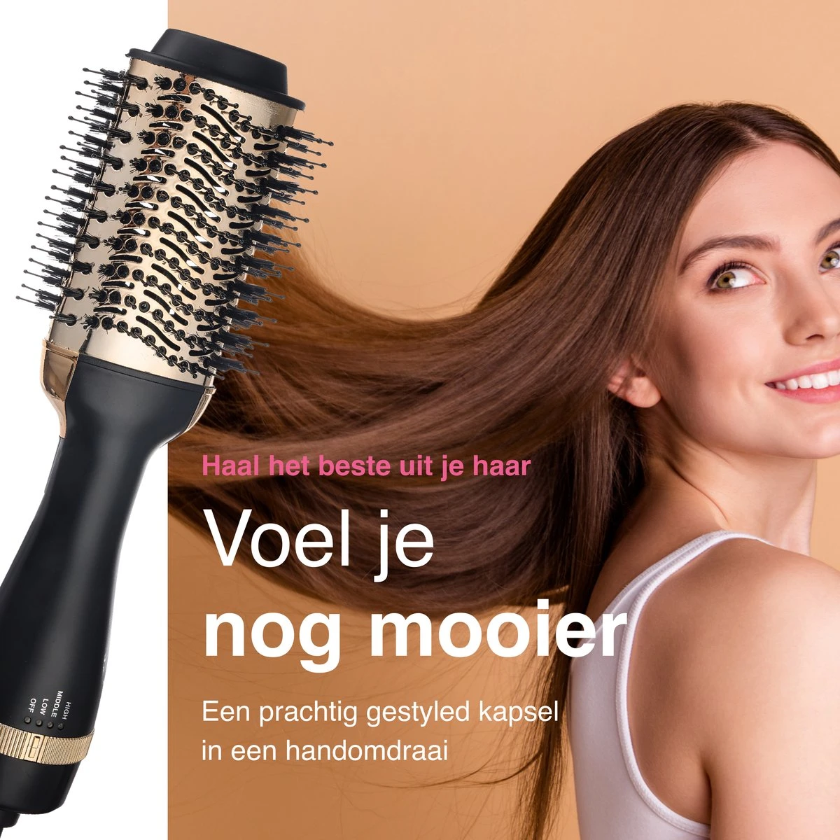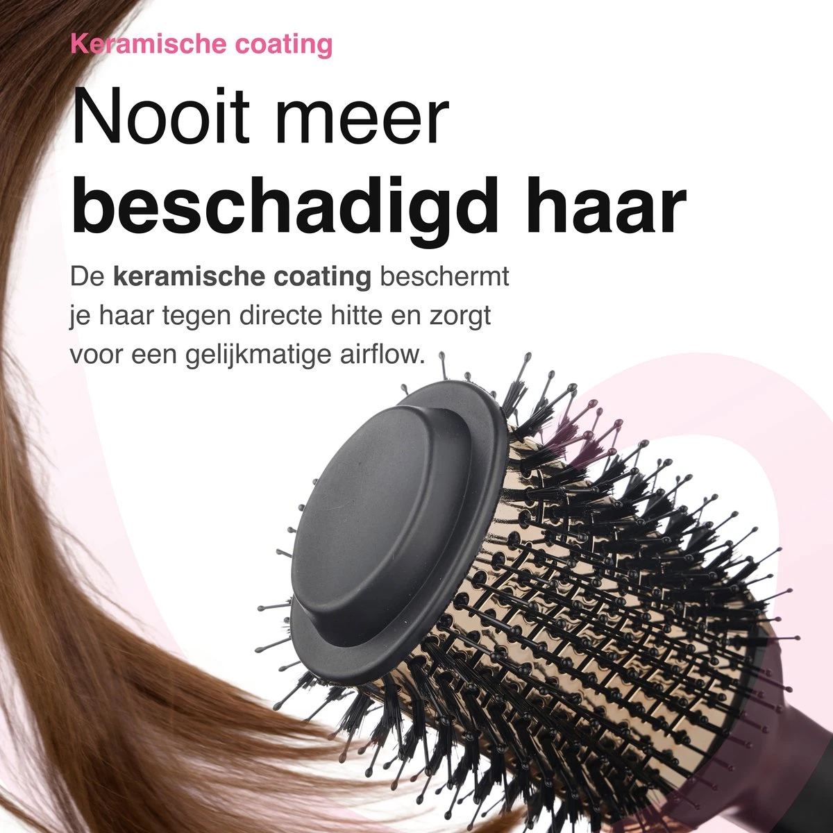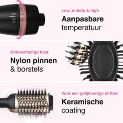 Wil je je haar föhnen, stijlen of krullen? Dit kan allemaal met onze föhn borstel! Geen gepruts meer met een borstel in de ene hand en een föhn in de andere, vanaf nu kan je met één product drogen, stijlen of krullen. En door de ovaalvorm van de kop is het extra eenvoudig om slag en volume te creëren. De kop is voorzien van flexibele nylon pinnen en borstelharen, deze zorgen voor klitvrij haar en zal het zijdezacht gaan aanvoelen. Bovendien zorgt de 2 meter lange en 360° meedraaiend snoer voor een volledige bewegingsvrijheid.
