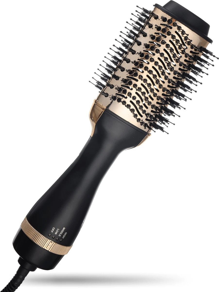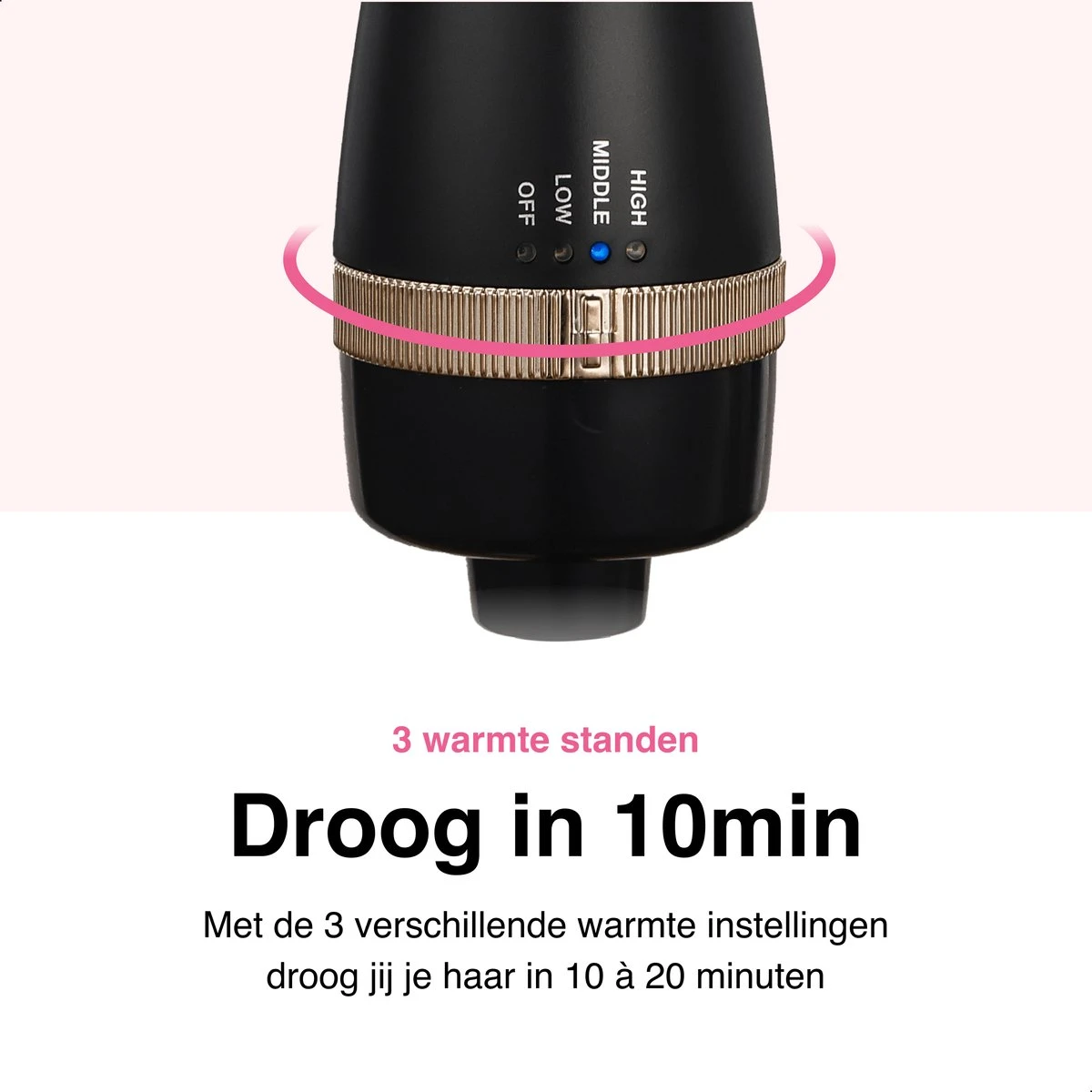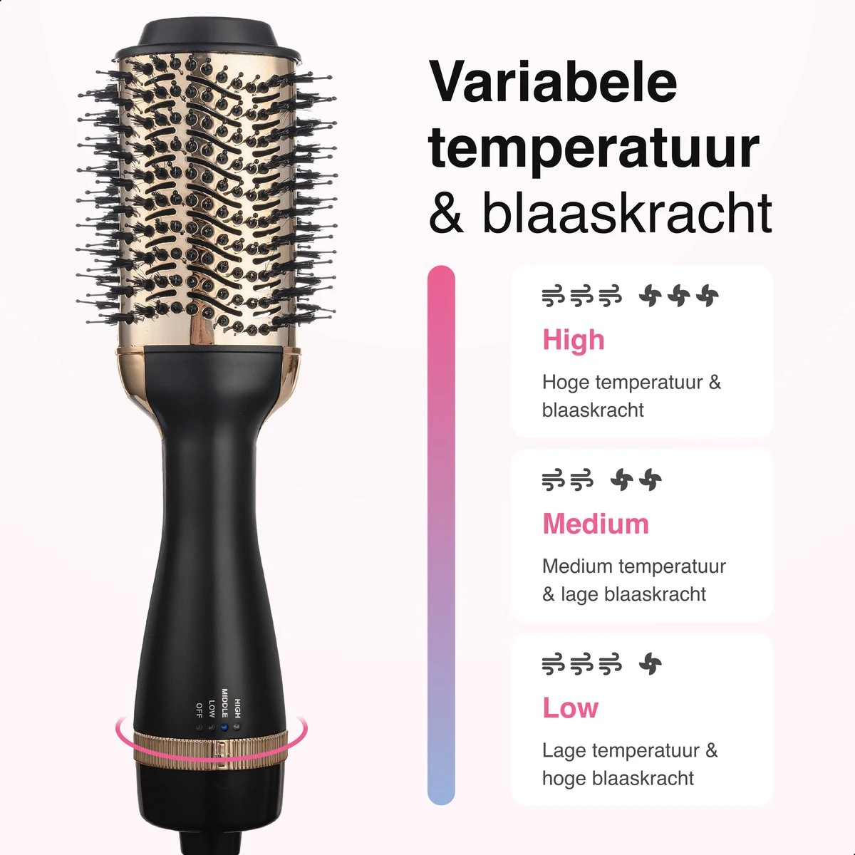 Wil je je haar föhnen, stijlen of krullen? Dit kan allemaal met onze föhn borstel! Geen gepruts meer met een borstel in de ene hand en een föhn in de andere, vanaf nu kan je met één product drogen, stijlen of krullen. En door de ovaalvorm van de kop is het extra eenvoudig om slag en volume te creëren. De kop is voorzien van flexibele nylon pinnen en borstelharen, deze zorgen voor klitvrij haar en zal het zijdezacht gaan aanvoelen. Bovendien zorgt de 2 meter lange en 360° meedraaiend snoer voor een volledige bewegingsvrijheid.
