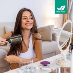 Met de Vivid Green Föhnborstel maak je het jezelf een stuk gemakkelijker om comfortabel je haar te doen. Dankzij zijn formaat en verschillende standen heb jij je haar snel droog, stijl en mogelijk een slag erin! Föhnen, stijlen en krullen kan allemaal me de 3 in 1 borstel en is deze geschikt voor ieder haartype en haardikte. Ook is de borstelkop voorzien van een keramische coating waardoor je zal je haar niet uitdrogen en zorgt de ionische technologie ervoor dat jou haar niet statisch wordt en pluisvrij blijft.