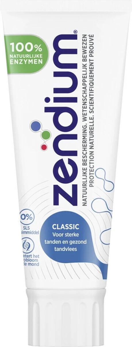 Zendium, natuurlijke bescherming, wetenschappelijk bewezen. Zendium Classic tandpasta bevat 100% natuurlijke enzymen die de goede bacteriรซn in de mond bevorderen en daarmee de mond op natuurlijke wijze beschermt. Voor sterke tanden, gezond tandvlees en een frisse adem. Het is erg belangrijk om je gebit goed schoon te houden. Door goed je tanden te poetsen houd je je gebit gezond. Daarnaast geeft het een heerlijk schoon en fris gevoel. Net als je lichaam heeft ook je mond een eigen weerstand, oftewel de mondweerstand. Speeksel is hier een belangrijk onderdeel van. Het beschermt je mond tegen schadelijke invloeden die klachten kunnen veroorzaken. De goede bacteriรซn in je speeksel spelen een rol in het beschermen je mond, maar zijn kwetsbaar en vragen om een zorgvuldige behandeling. Zendium tandpasta bevat 100% natuurlijke enzymen – die van nature in je speeksel voorkomen – en de beschermende werking van het speeksel versterken. Zo poets je niet alleen je gebit schoon, maar werk je ook aan je mondweerstand. Zendium bevat fluoride om het glazuur van je tanden te versterken. Zendium bevat geen SLS. SLS is een schuimmiddel dat hard kan zijn voor de gevoelige delen van de mond. Zendium gebruikt milde ingrediรซnten waardoor het zacht is en geschikt is voor zelfs de gevoelige mond. Zendium tandpasta is verkrijgbaar zonder kartonnen doosje. Dat bespaart 30% verpakkingsmateriaal.